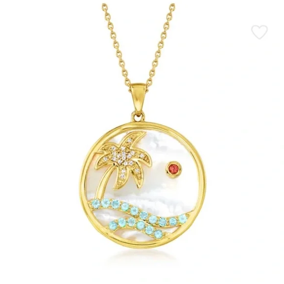 MOTHER-OF-PEARL AND SWISS BLUE TOPAZ IN 18KT YELLOW GOLD OVER STERLING SILVER — 23mm mother-of-pearl and 1.75 ct. t.w. Swiss blue topaz paradise pendant necklace in 18kt yellow gold over sterling silver. Round single-cut mother-of-pearl. Round Swiss blue topaz. Round sapphire and diamond accents. 1.25mm cable chain from Italy. 18 in. long by 1 in. wide. Lobster clasp.(I HAVE TWO OF THESE AVAILABLE, LET ME KNOW IF YOU WANT TO BUNDLE) Metal:18kt Yellow Gold Over Sterling SilverFinish:PolishedChain:CableChain Size:1.25 mmClasp:LobsterBale:SingleFits Chain:3.2 mmChain Included:YesGemstone 1:Mother of Pearl ( Color: White, Quantity: 1, Shape & Cutting Style: Round Single-Cut, Size: 23 mm)Gemstone 2:Sapphire ( Color: Orange, Quantity: 1, Shape & Cutting Style: Round, Weight: 0.06 carats, Size: 2.5 mm)Gemstone 3:Topaz ( Color: Blue, Quantity: 16, Shape & Cutting Style: Round, Weight: 2.80 ct. t.w., Size: 1.75 mm)Gemstone 4:Diamond Accent ( Quantity: 18, Shape & Cutting Style: Round Single-Cut, Clarity: I1-I2, Weight: 0.05 ct. t.w.)