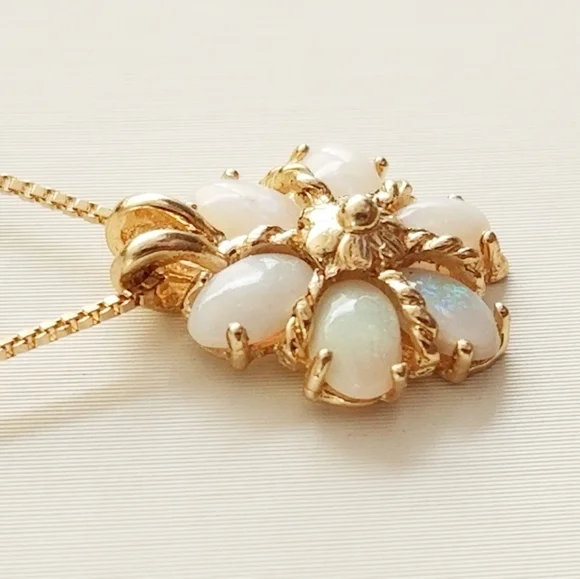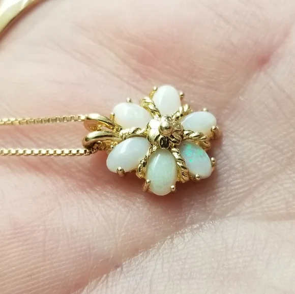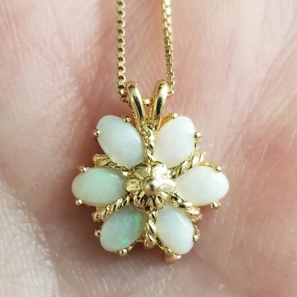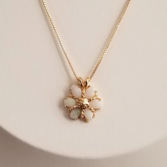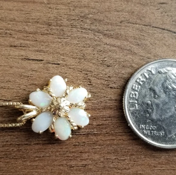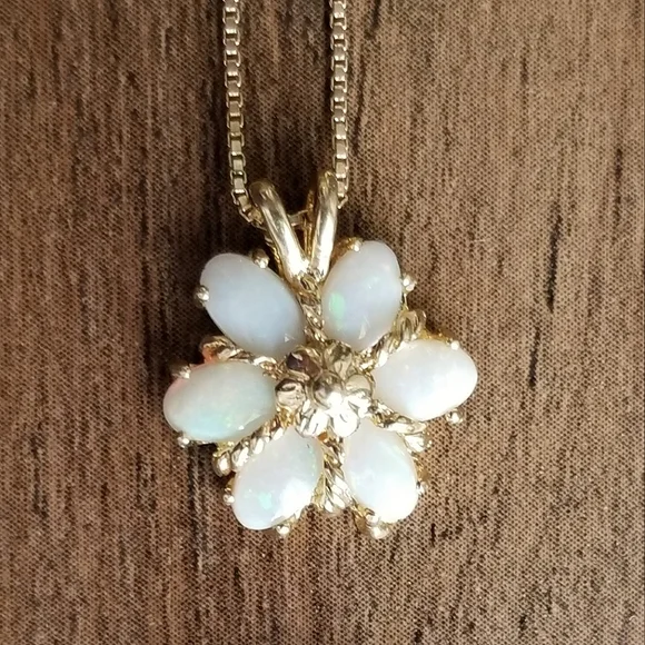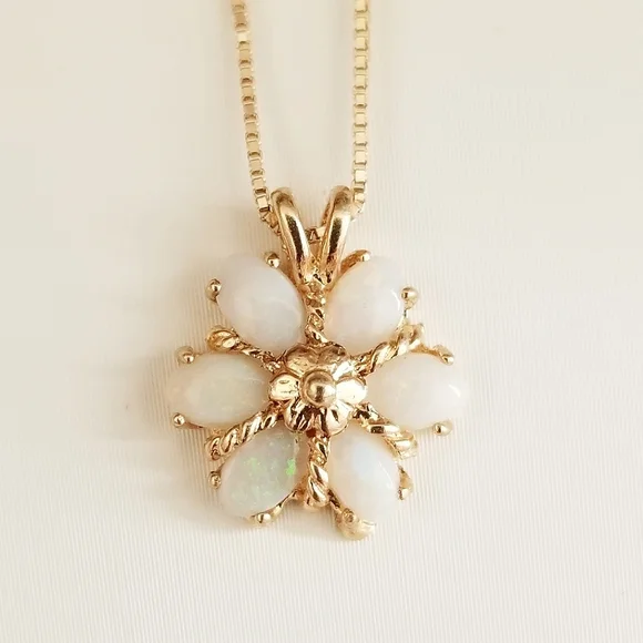 Vintage 14K Gold Opal Pendant Necklace Metal- Solid Gold Color Gold- Yellow Gold Stone(s)- Opal Chains Approx. Length- 15 1/2" (See Photos) (Chain is a Short Length Chain)Stamped/Makers Markings- 14K HZ (Chain)Pendant Solid Gold too but not stampedApprox. Weight- 2.41gramsCondition- Used/Vintage, has regular wear PRICE IS FIRM