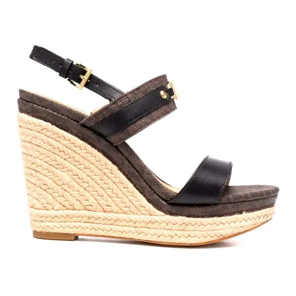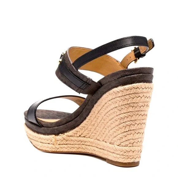 Michael Korslogo-plaque wedge sandals size 8Brown leather logo-plaque wedge sandals from MICHAEL KORS featuring gold-tone logo plaque, monogram print, buckle-fastening slingback strap, open toe, braided raffia wedge heel, high heel and branded insole.ImportedCompositionLining: Leather 100%Outer: Polyurethane 100%, Calf Leather 100%Sole: Polyurethane 100%
