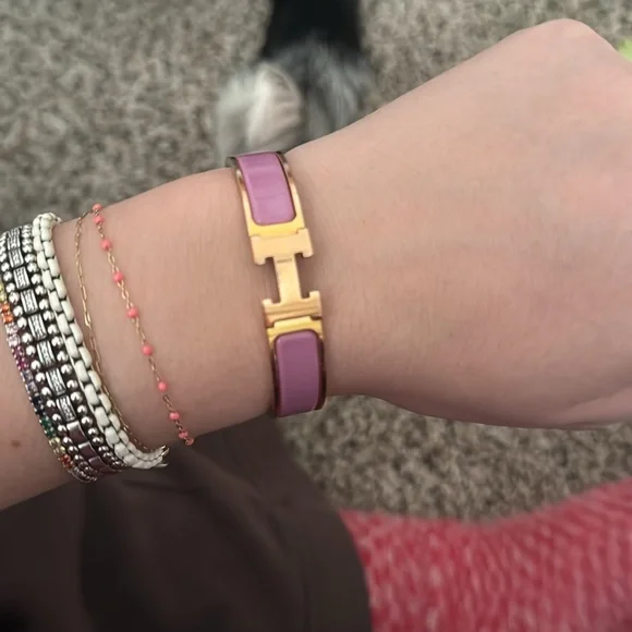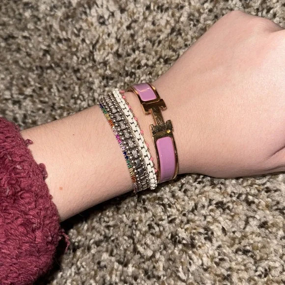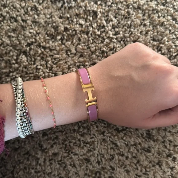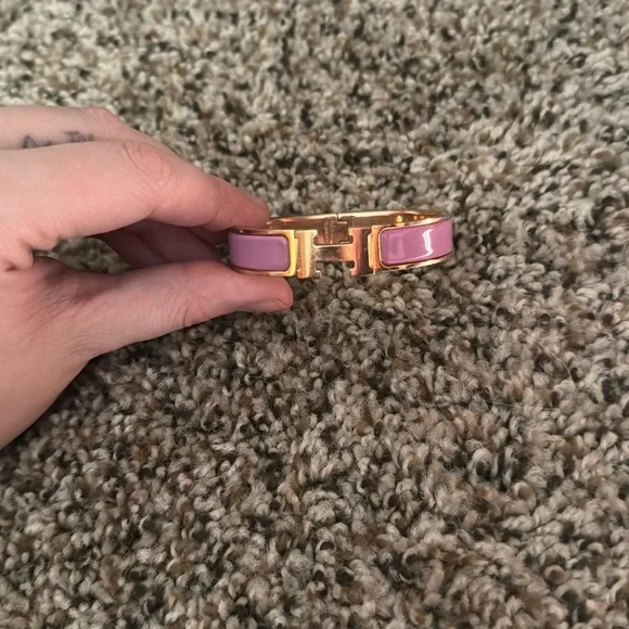 The bracelet has been worn and does have some scratching andsigns of love/wear. It is a wonderfully stunning bracelet and is a brighter pink than the first photo. There is a photo...
