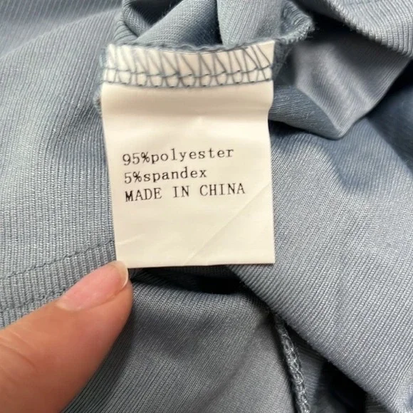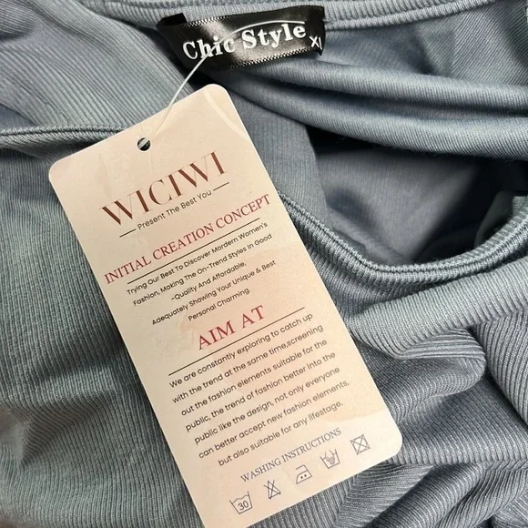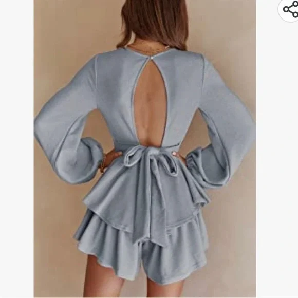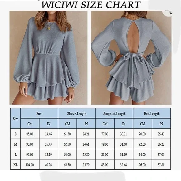 WICIWI Women Casual Lantern Long Sleeve Solid Mini DressJumpsuits Layered Ruffle Hem Hollow Out Belted A-line Romper Solid Blue Gray Color Size X-LargeFeatures - Women Long Lantern Sleeve A-Line LayeredRuffle High Waist Jumpsuit / Lightweight / Attached Tie WaistBelt / Sexy Hollow Out At Back / Crewneck / Solid Color/ Backless / Button Closure And Short Zipper on Back / Trendy Sexy Casual Elegant Style / Loose Fit