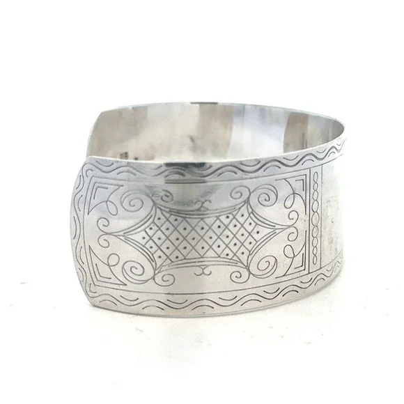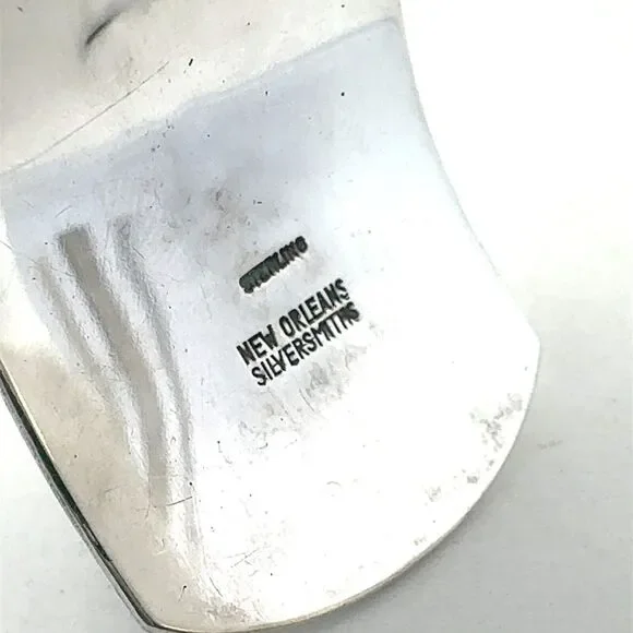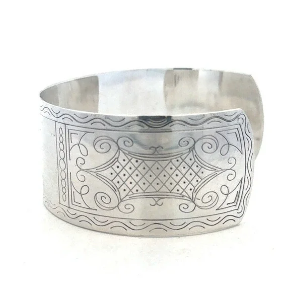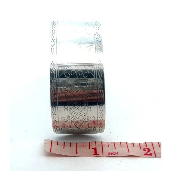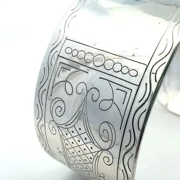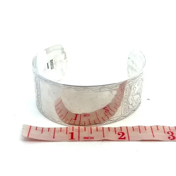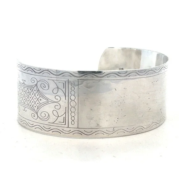 * New Orleans Silversmiths Sterling Silver Etched Engravable Open Cuff Bracelet* Inner cuff measures: 5-1/2"* Gap measures: 1-1/2"* Band width: 1"* Weight: 32.8 g* Marked: New Orleans Silversmiths * Sterling * Condition: As pictured. * S7254