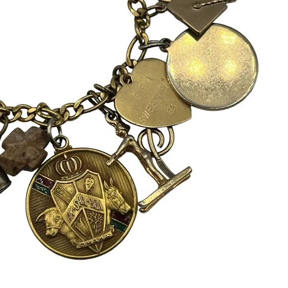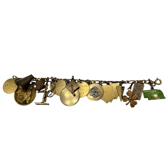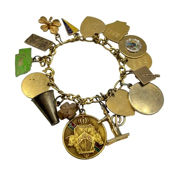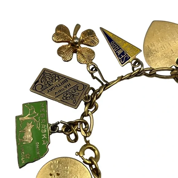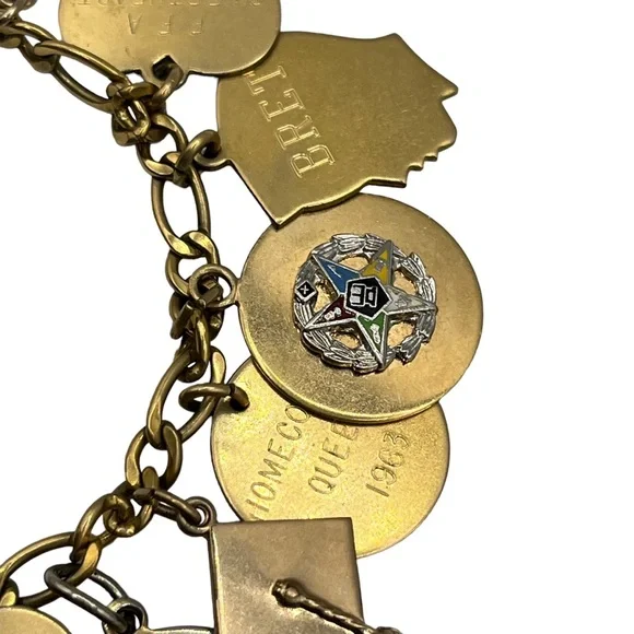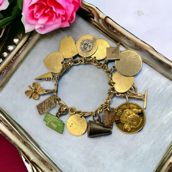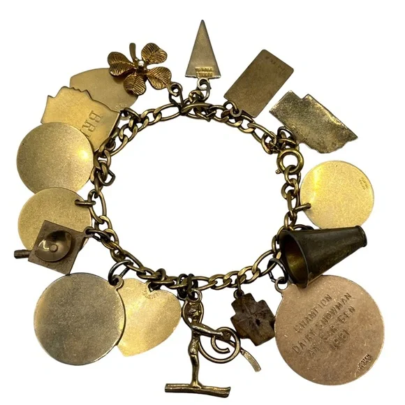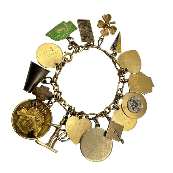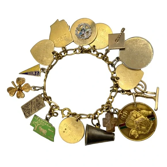 Vintage Signed 1/20 12K GF Josten Frostner Wells Sterling Life Memory Memorabilia Charm Bracelet 5.5”In pre-owned condition. Have patina, wear and tear due to age and use. Size: 5.5”length. Signed: yes. Sold as is. No refund. Display items are not included. A great piece to add on your collection. Wonderful gift for ones who love collecting antique/vintage items.Item might show some wears consistent with age and use. I believe this will add more charm to your collection. I still have a tons of #antique #vintage collectibles listed in our store. Browse around, purchase more! I’m glad to combine shipping! Thank you for stopping by!