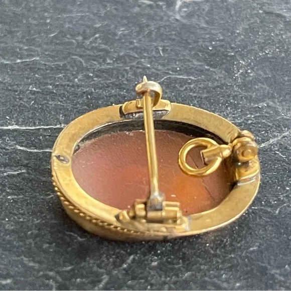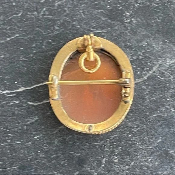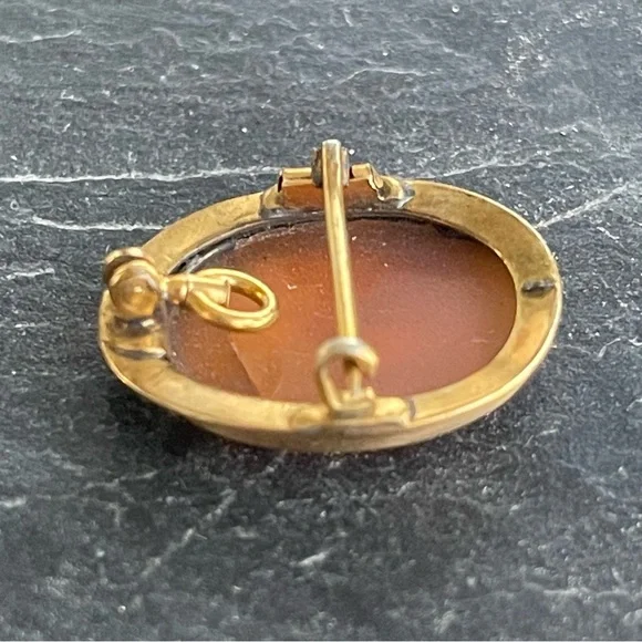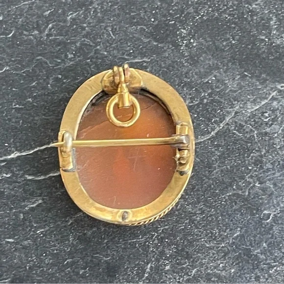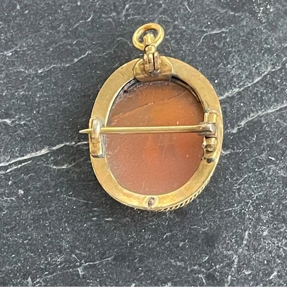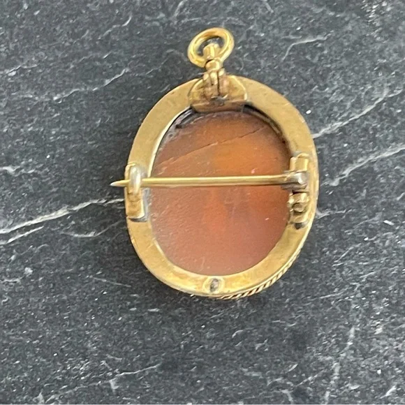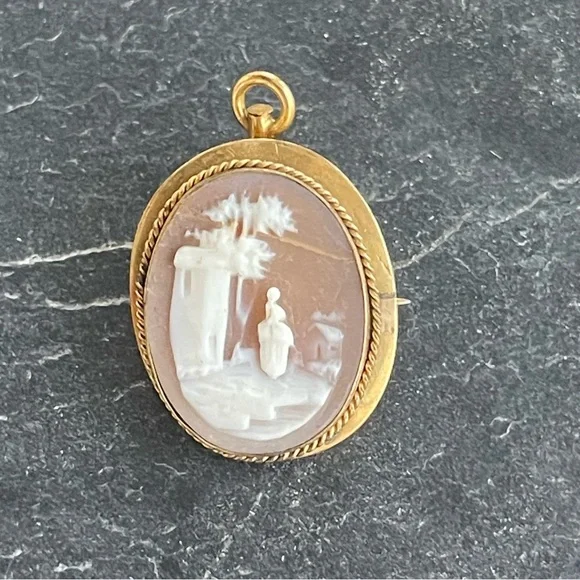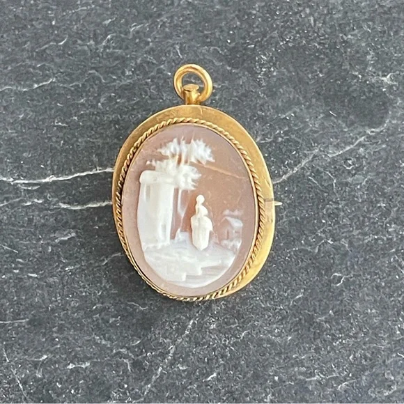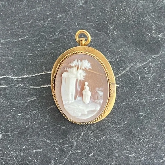 Vintage Antique Cameo hand carved shell Scenic carving, frame, pin back and pendant is 10kt. Yellow gold, beautiful detail in carving, 23mm long and 19mm wide, weighs 2.7 grams.