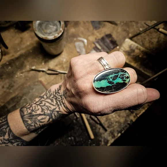 San Pedro Variscite & Sterling silver ring.**Made to size upon order. Must specify size (to the half-size) via message upon ordering. No resizing available after order.Handmade in the US. Sterling & fine silver. San Pedro Variscite mined in Nevada. TM´ed "LMS Silver" on rear of backplate. Price is firm. Feel free to ask any questions.