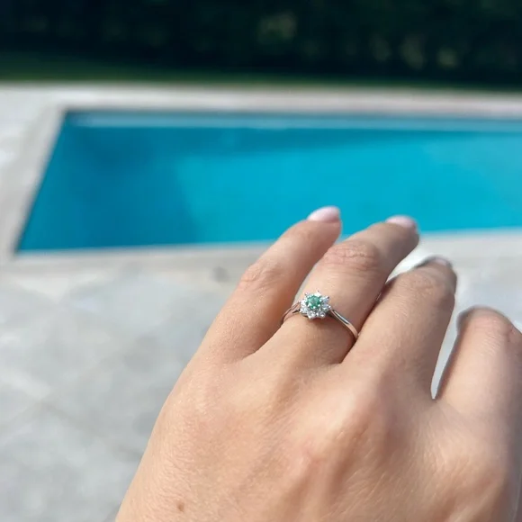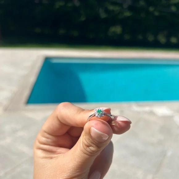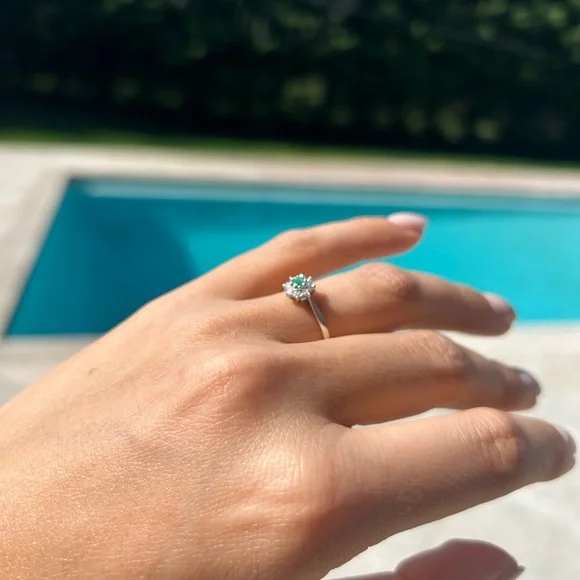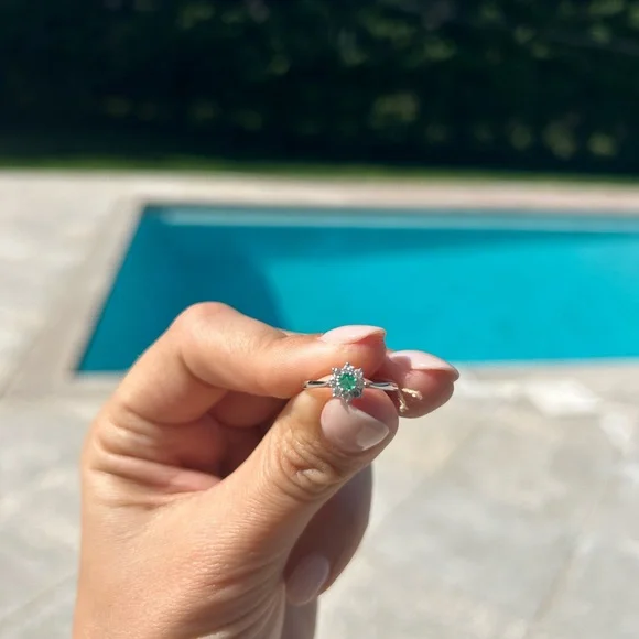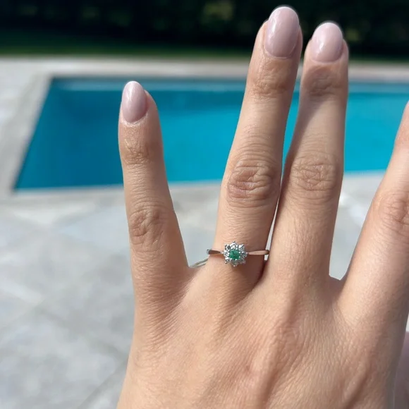 This floral emerald diamond ring Emerald .10 pointers8 diamonds total .25 pointers Size 6 ring 9K gold 1.43 total grams