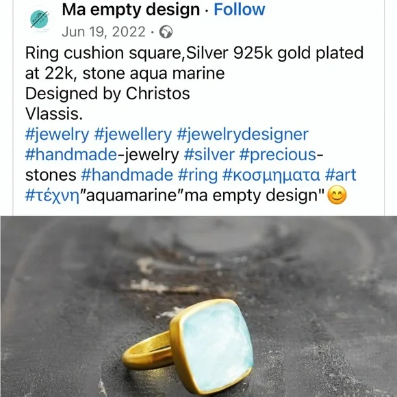 New beautiful one of a kind aqua marine square stone ring Sterling Silver with 22k gold plated purchased last summer in Athens, Greece by local jeweler See 3rd pic. (I have gained...