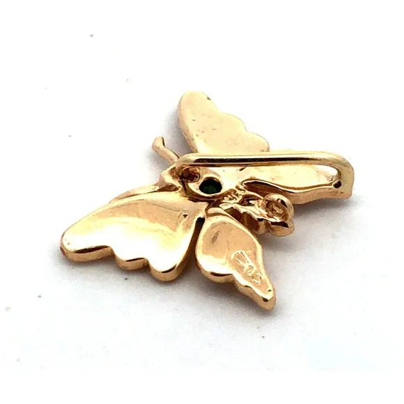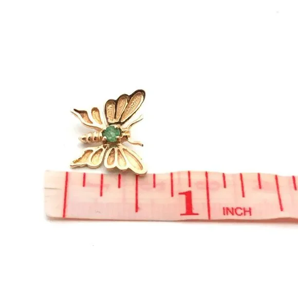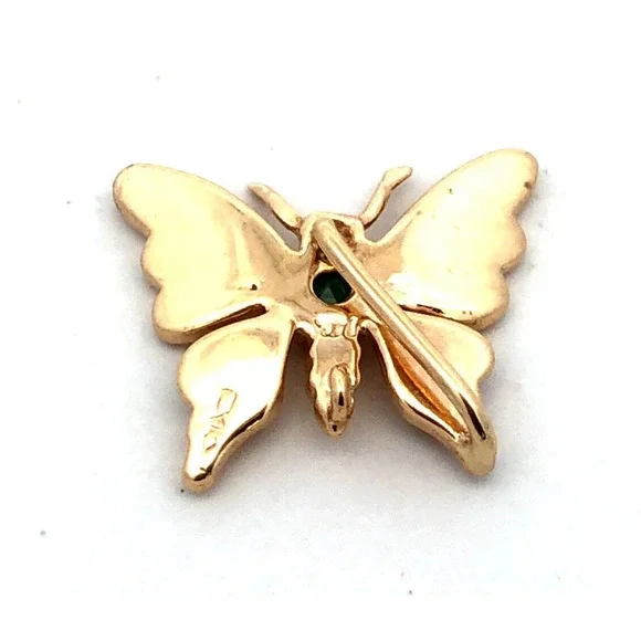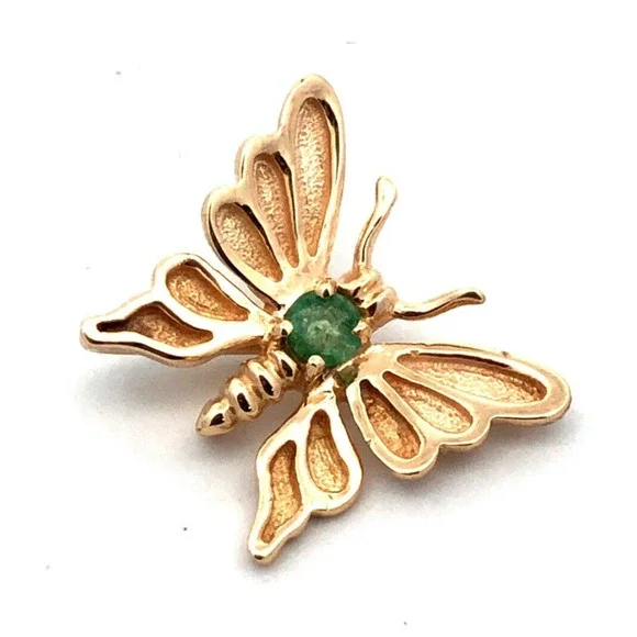 * Designer 14K Yellow Gold Round Green Emerald Moth Butterfly Pendant* Length: 9/16"* Width: 9/16"* Inner bale measures: 9 mm x 1.25 mm * Weight: 1.5 tgw* 1 Round Emerald measures approximately 3.2 mm * Chain is sold separately. * Marked: Makers Mark * 14K * Condition: As pictured. * G4827