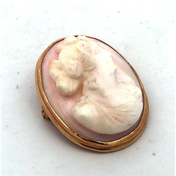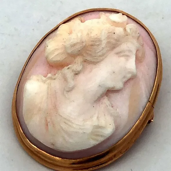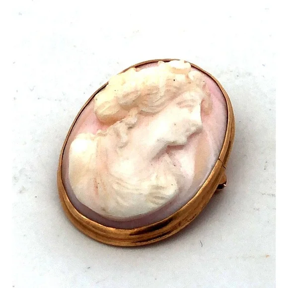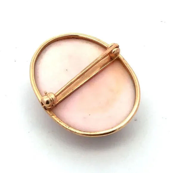 Estate 10K Yellow Gold Light Pink White Oval Carved Cameo Pin Brooch