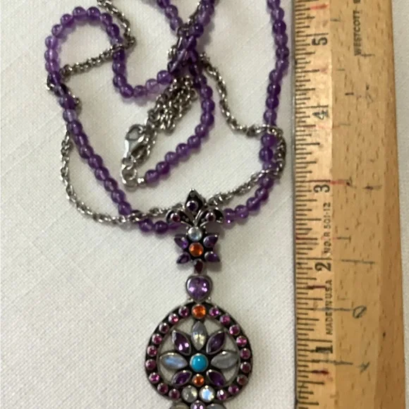Elegant necklace with purple beads. Features a floral pendant with colorful stones. Perfect for adding a pop of color.See pictures, matching earrings available. I will give a 10...