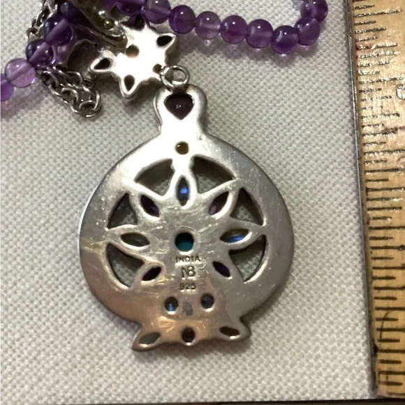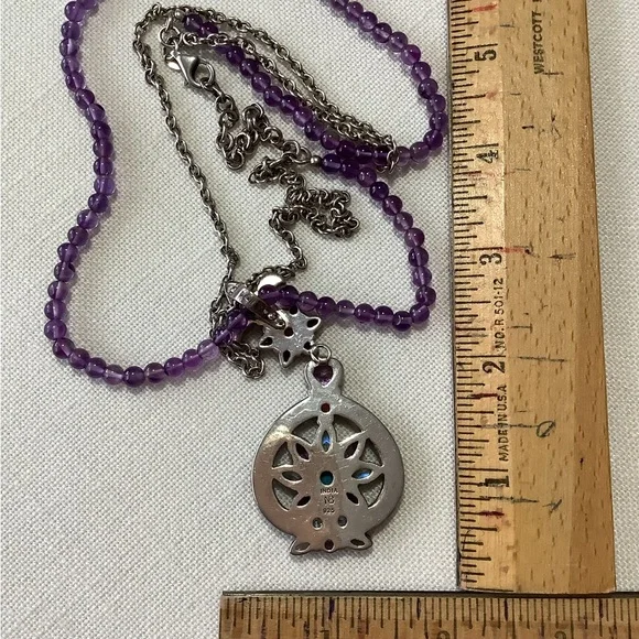 Elegant necklace with purple beads. Features a floral pendant with colorful stones. Perfect for adding a pop of color.See pictures, matching earrings available. I will give a 10 percent discount as a bundle together.