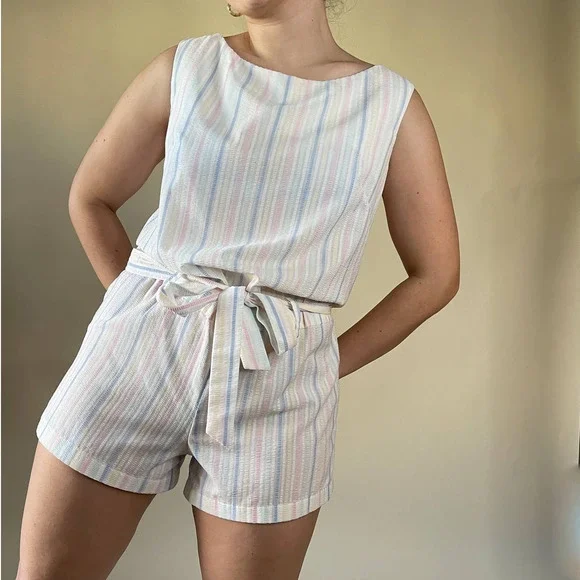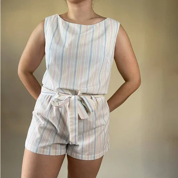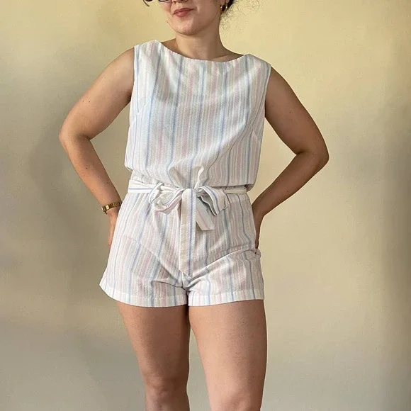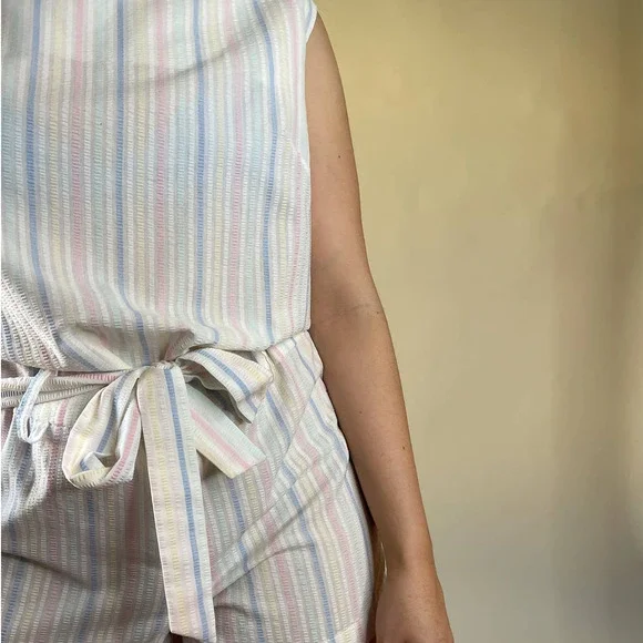 70s Vintage Pastel White Striped Homemade Tie Waist Romper Size S-M70s homemade romper in pastel white featuring sleeveless, boat neckline, striped print, tie at waist, elastic...