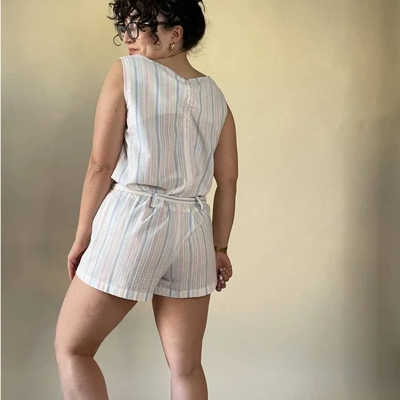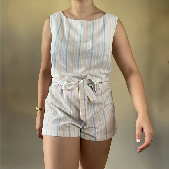 70s Vintage Pastel White Striped Homemade Tie Waist Romper Size S-M
