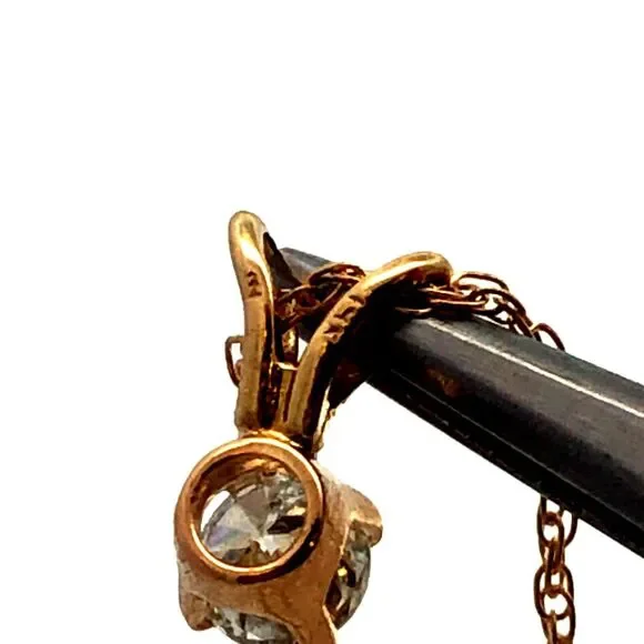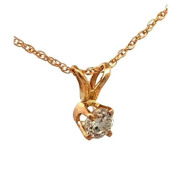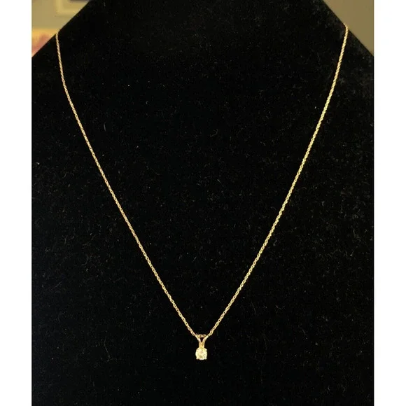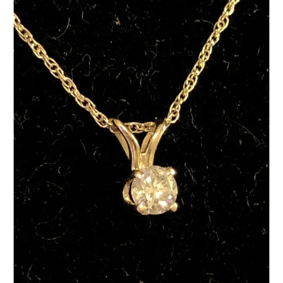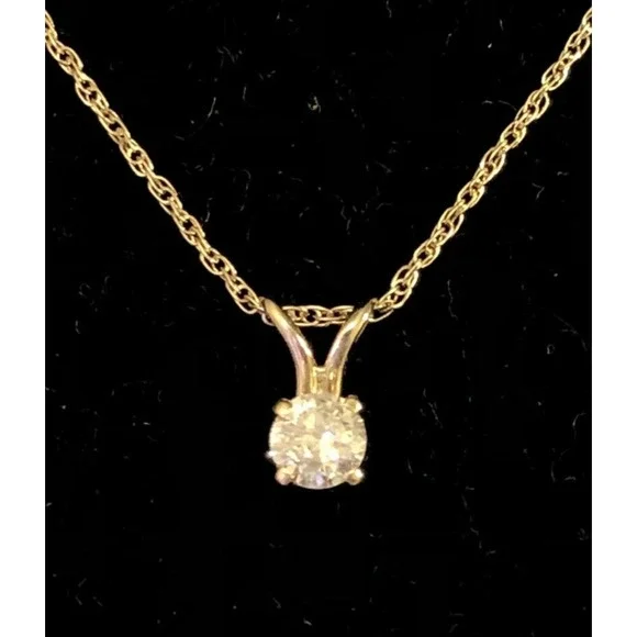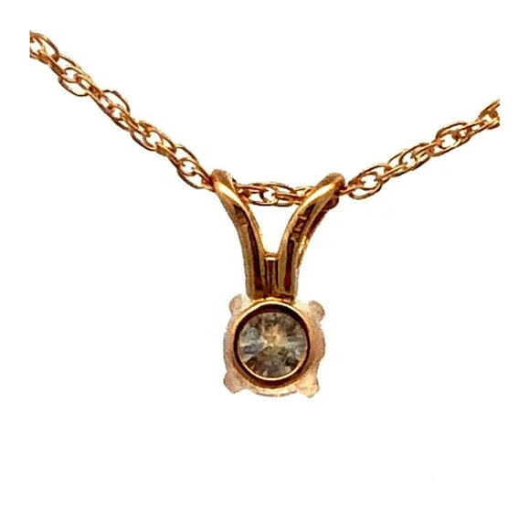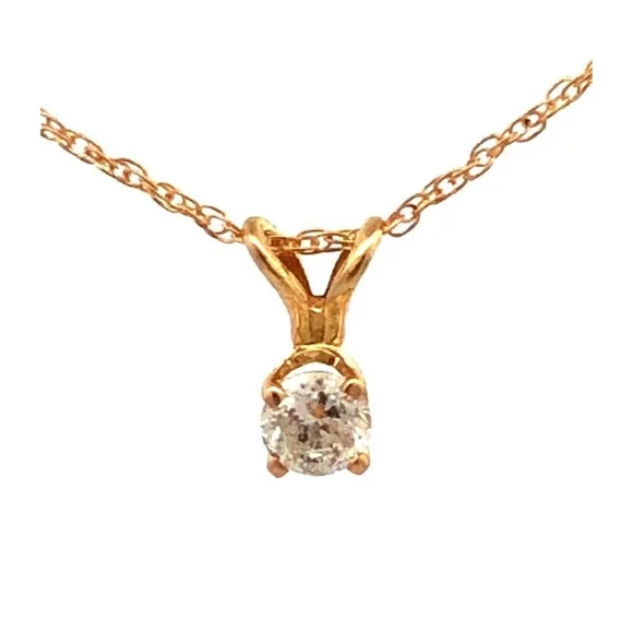 * Designer 14K Yellow Gold Round Diamond Solitaire Pendant Chain Necklace* Length: 18" * Pendant length: 5/16"* Pendant width: 1/8" * Weight: 0.8 tgw* 1 Round Diamond measures approximately 3.4 mm, approx. .15 carat* Closure: Spring Ring * Marked: 14K * Makers Mark * Condition: As pictured. * G4890