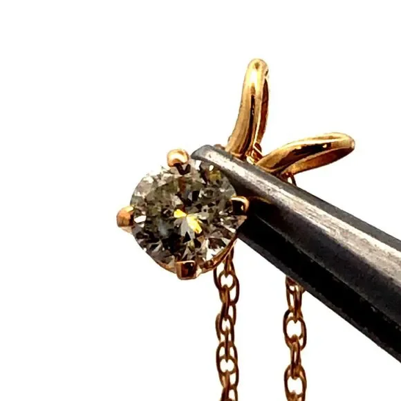 * Designer 14K Yellow Gold Round Diamond Solitaire Pendant Chain Necklace* Length: 18" * Pendant length: 5/16"* Pendant width: 1/8" * Weight: 0.8 tgw* 1 Round Diamond measures...