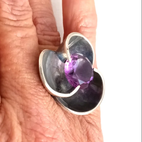 Three dimensional flower petals curve to hold an amethyst stone suspended and in a way that lets the stone move on purpose so it shimmers. Stone measures approximately 15 mm across, the whole flower measures approximately 1 1/8 inches across. Marked with the classic B Taller Taxco Hecho en Mexico. This ring was made circa 1950s. Well made with nice weight, this ring is sterling silver and is a size 6. Original untouched patina leaving the polishing to the preference of the buyer.