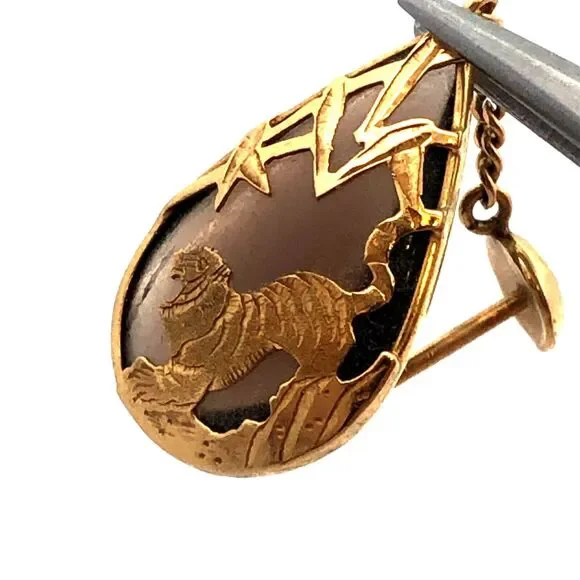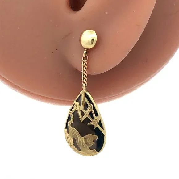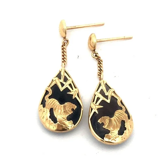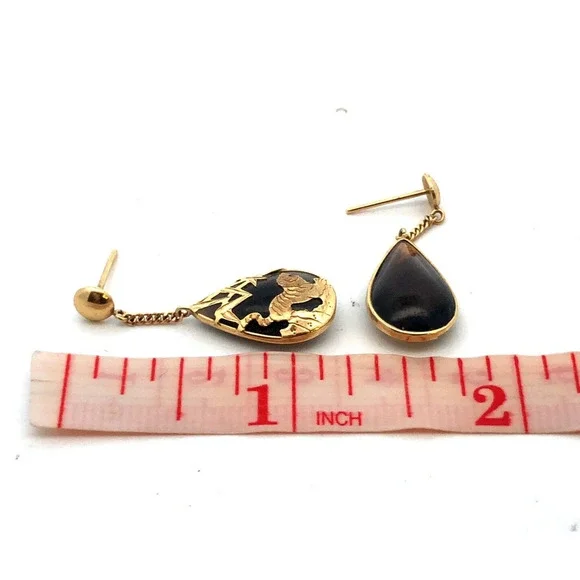 Estate 14K Yellow Gold Teardrop Smokey Quartz Etched Tiger Dangle Stud Earrings