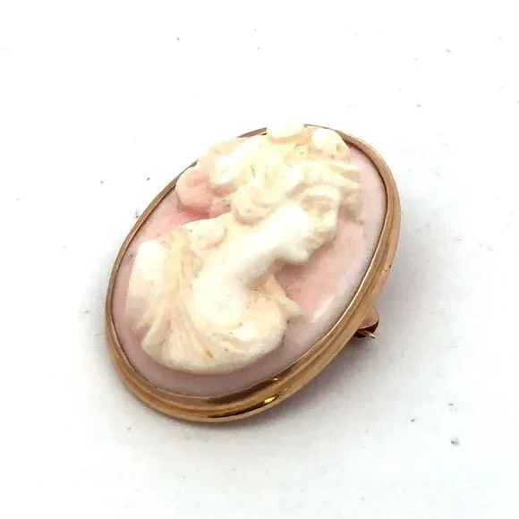 * Estate 14K Yellow Gold Carved Light Pink Cameo Oval Pin Brooch* Length: 1"* Width: 3/4"* Weight: 5.4 tgw* Unmarked. * Professionally assayed. * Condition: As pictured. * G4779
