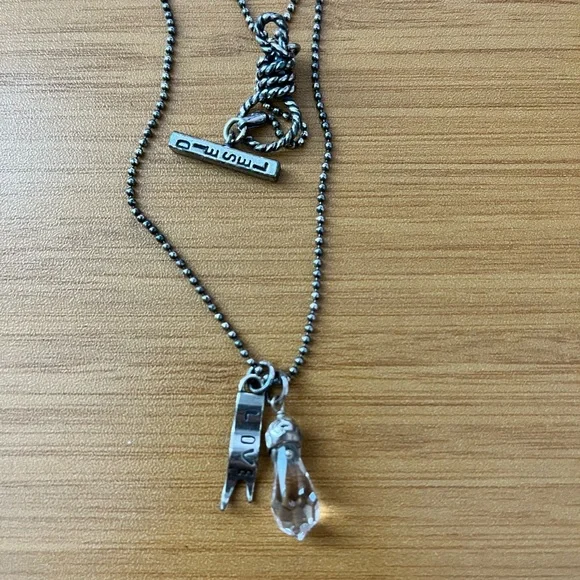 Excellent NWOT necklace. Noose closure. Crystal and LOVE stamped banner. Unisex.