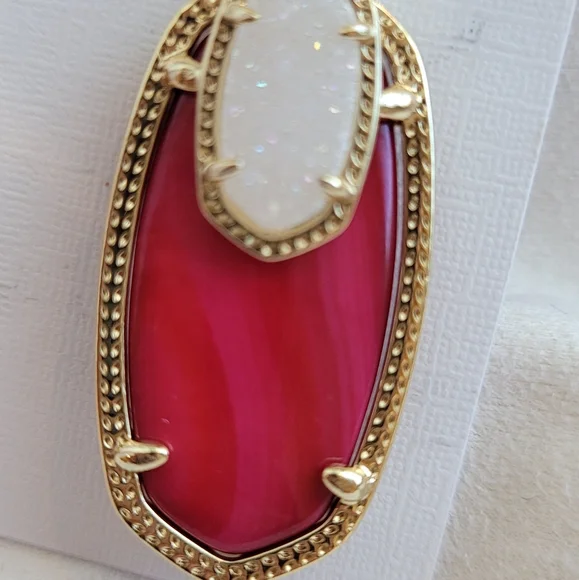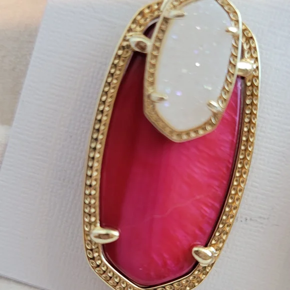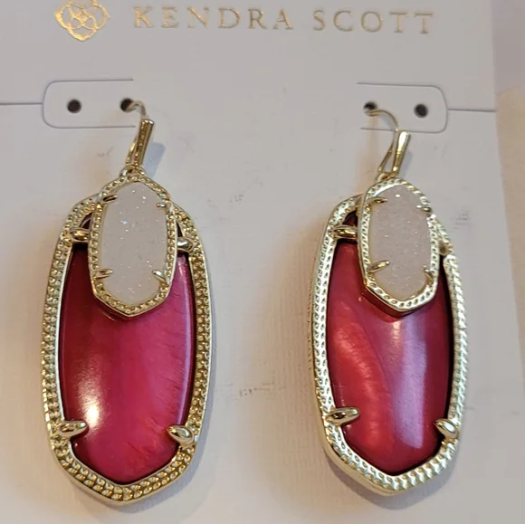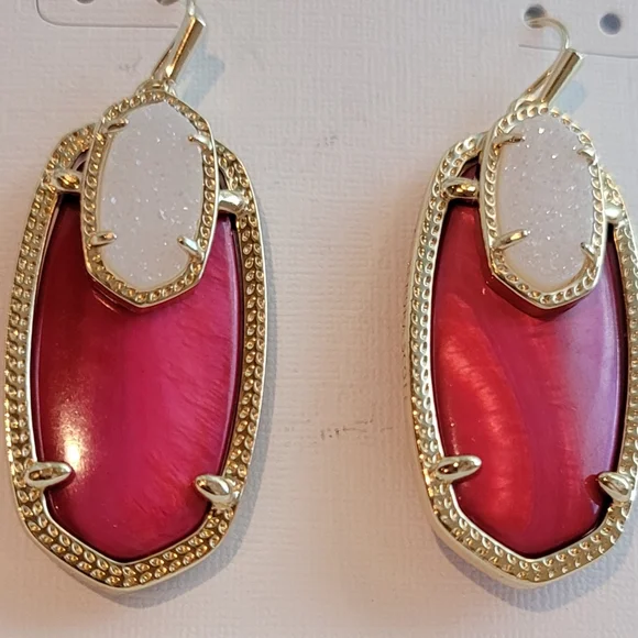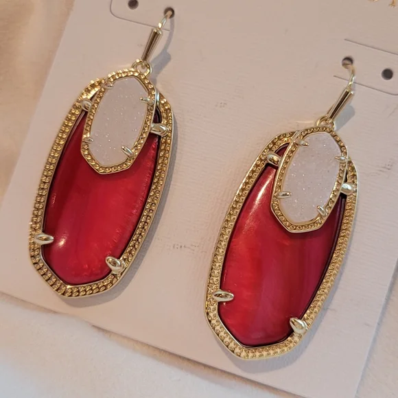 Custom Kendra Scott Red pearl & Iridescent Drusy Emmy Drop Earrings in gold. So beautiful!! Rare color combination in this style! These stones are super gorgeous! Never worn.Earrings will come in a kendra scott gift box with pouch.Will ship with care!Please note: These were customized using all new Kendra Scott components and did not come from Kendra Scott like this. There is a possibility there may be very slight flaws to hardware/prongs on back & side of earrings if look very closely due to customization. Would not be noticeable while wearing. Please only purchase if ok with this. This customization of these earrings was hard and time consuming.14K Gold plated over brass.crossposting