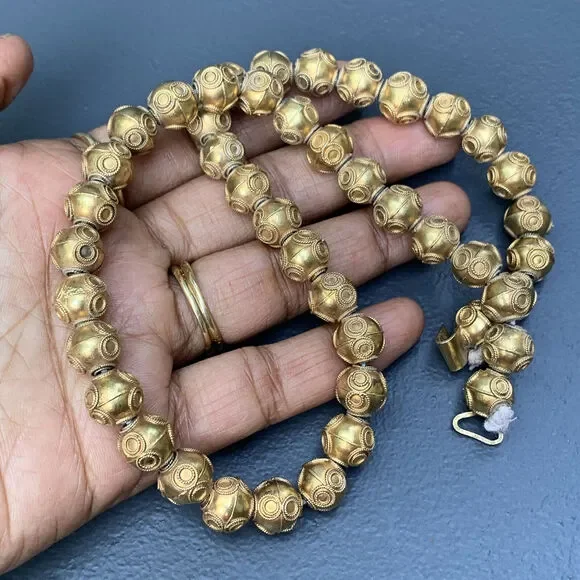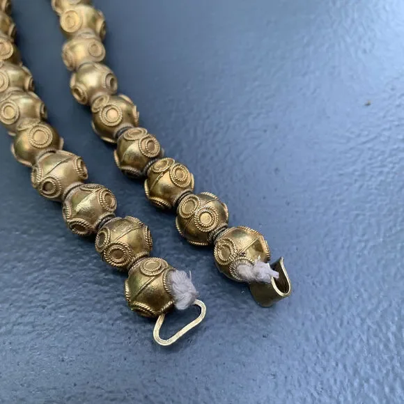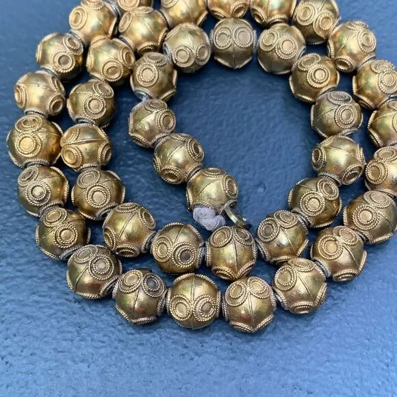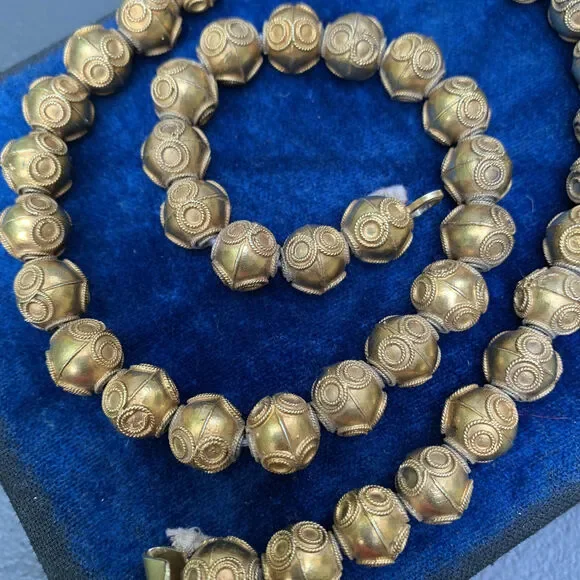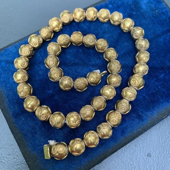 Antique Victorian ~ Etruscan ~ gold gilt silver ~ beaded necklace with Etruscan style applied wire work on hollow beads of same size ~ Necklace ends with folded clasp ~ Most likely made in India or Sri lanka Dates 1900´s ~ Unsigned but acid tested for silver ( higher grade silver , atleast 900 silver ) .Measurements:Necklace measures 17 1/2 inches in wearable length x 3/8 inches wide .Weighs 46 grams on my weighing scale .Condition :Overall good antique condition considering its age ~ can see small part of thread at both ends ~ Some wear/loss to gold gilding ~ Clasp is in good working order .Please Note ~ As vintage items are previously loved /used please do expect some minor wear like surface wear /dents /dings and metal discoloration . All items are carefully inspected and major flaws will be listed separately ~ Plenty of photograph are added so please study the photos carefully as it is also part of description or if you need more pictures just message us we will be happy to provide them :)...Box is for display purpose does not included with the item .. but your items will be packed carefully and shipped promptly .Powered by ExportYourStore.com