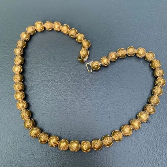 Antique Victorian ~ Etruscan ~ gold gilt silver ~ beaded necklace with Etruscan style applied wire work on hollow beads of same size ~ Necklace ends with folded clasp ~ Most...