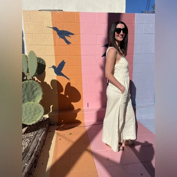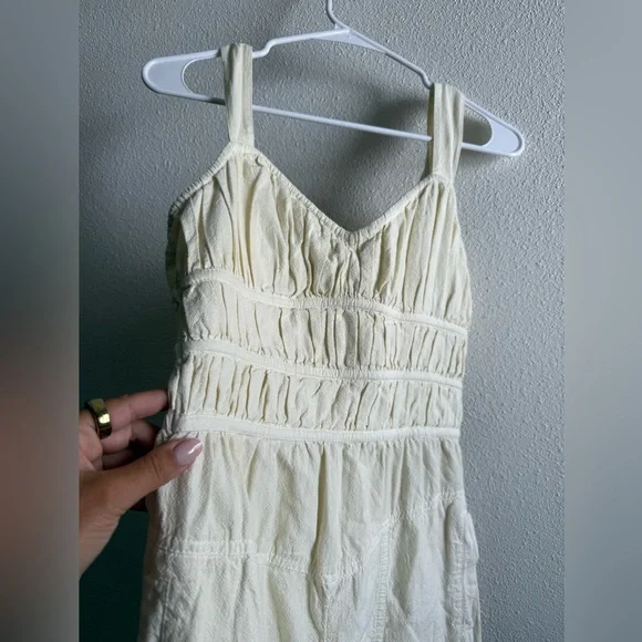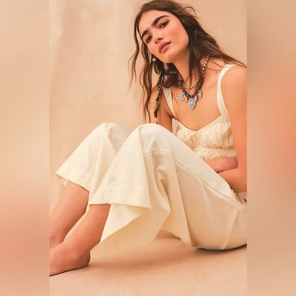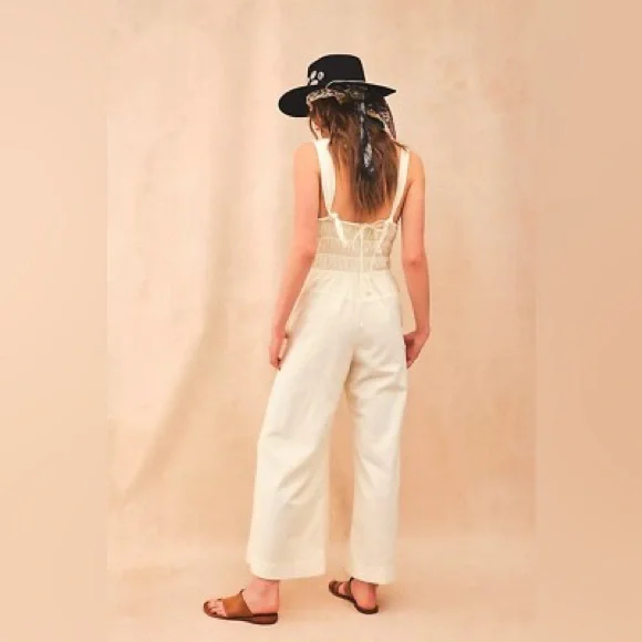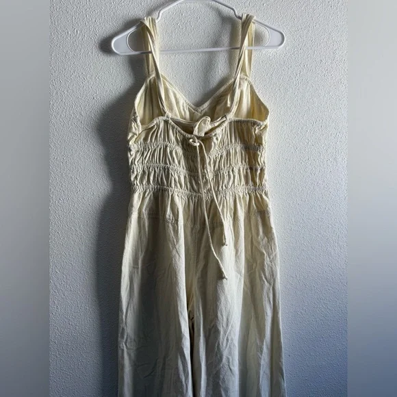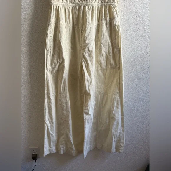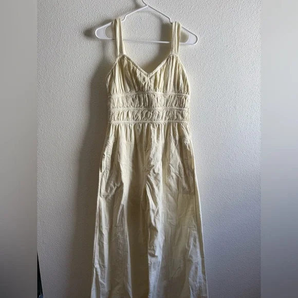 Free People Women´s After All Ruched JumpsuitSize SPure, light-colored cotton composes this Free People jumpsuit, which juxtaposes a wide-leg cut with a pleated, formfitting bodice. Complete your look with a dark pair of leather boots.In great condition - it’s almost like the cream butter yellow.