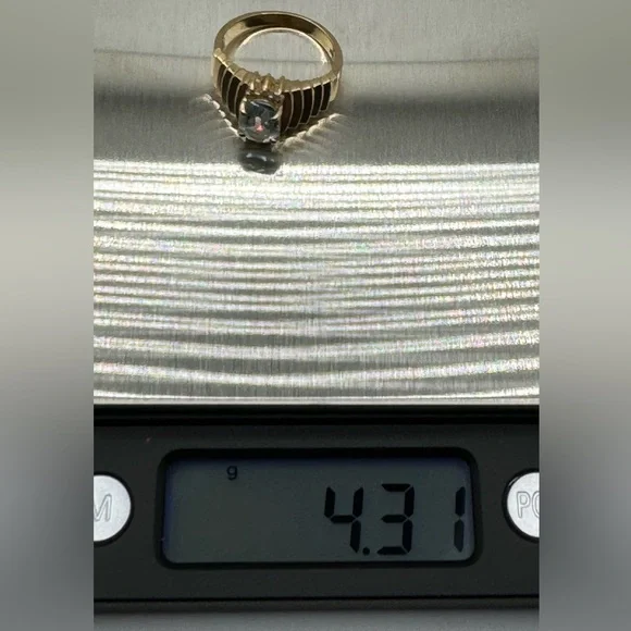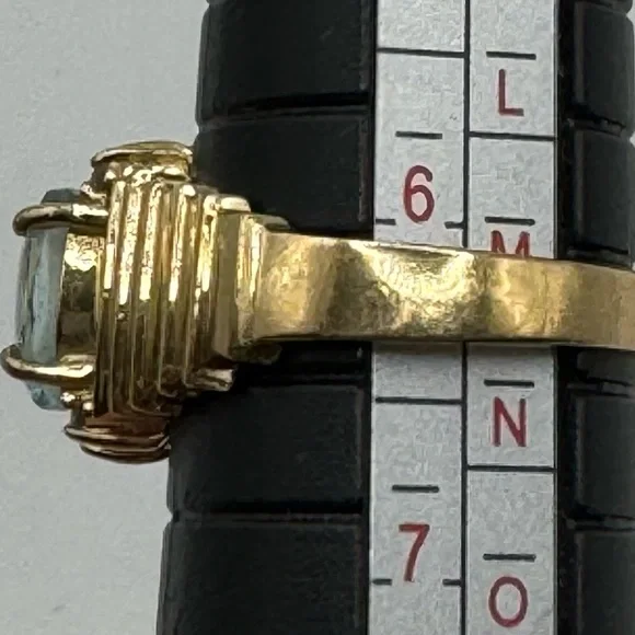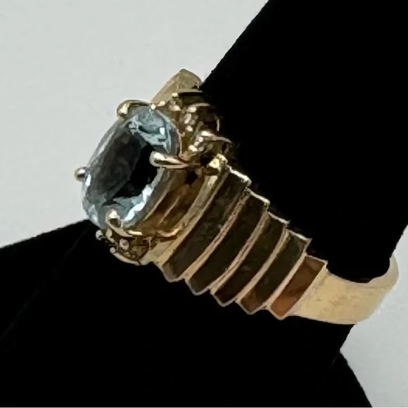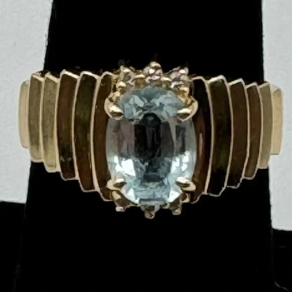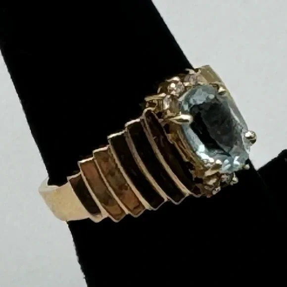 14kt yellow gold aqua marine and diamond ring4.31 grams 14kt solid yellow gold (weight includes stones)Size 6.25All items have been previously owned, worn and loved; unless otherwise noted. Some items may have signs of wear. Please read descriptions and review photos of each listing for size, measurements, weights and stamps. All descriptions are to the best of my knowledge and abilities to show and describe 3D objects in a 2D listing.