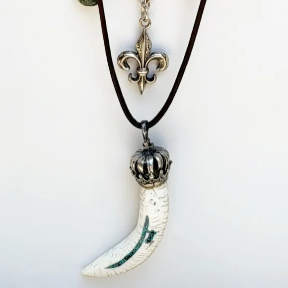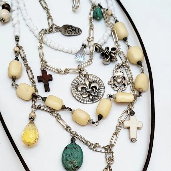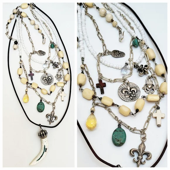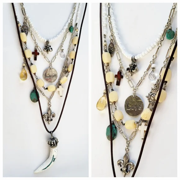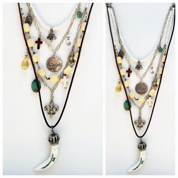 Sterling Silver Multi Strand Necklace with White Turquoise And Charms This is a Multi Strand Necklace with Longest Strand in Leather with a white Turquoise Horn pendant. Two strands of Sterling silver chain garnished with SS charms, and semi precious stones. The shortest Strand is made from shells and has a SS Fleur-de-lis. This Multi layered Necklace is just stunning. Shortest Strand is 15" and longest is 24" with adjustable hook closure to wear even longer if you wish. (#199)
