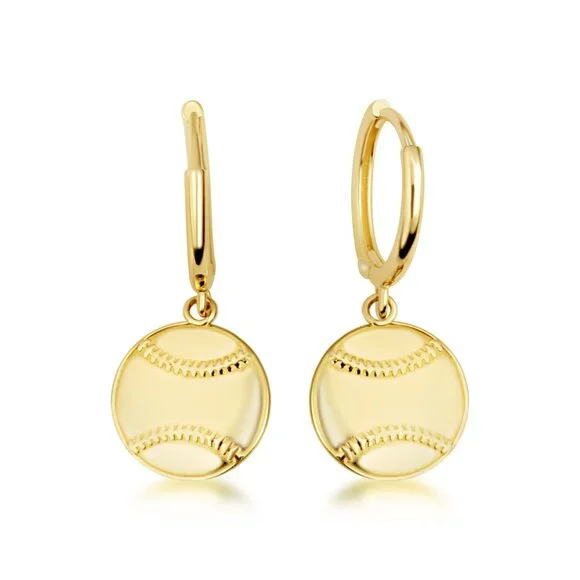 14K Solid Gold Small Baseball Sports Drop Huggies Hoop Earrings
