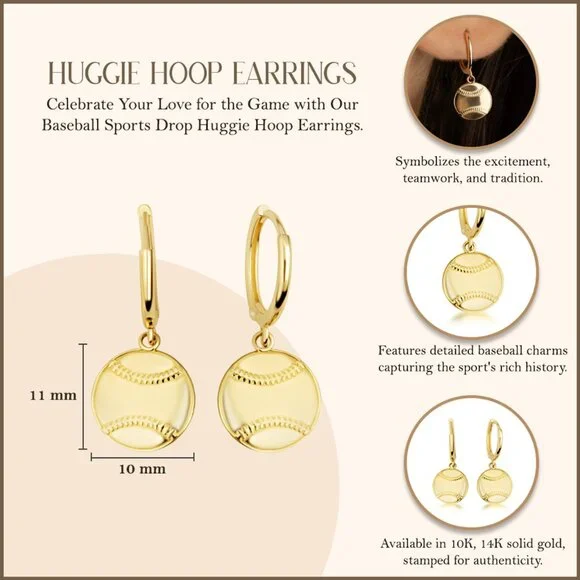 Description:14K Solid Gold Small Baseball Sports Drop Huggies Hoop Earrings Item No.:H136Metal type:14K Solid Gold (stamped 14K), (available in 10K)Metal color:Yellow...