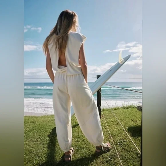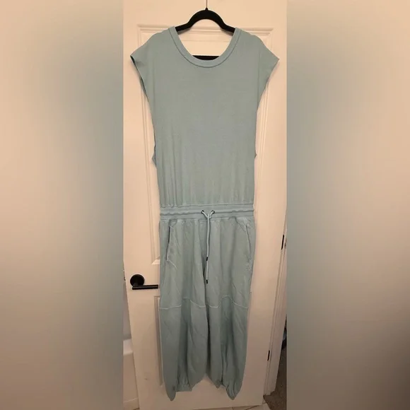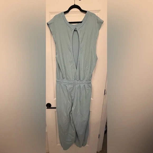 New without tags. Designed to be thrown on over your favorite workout set this easy onesie is featured in a breathable fabrication and sleeveless silhouette with a cinched waist and billowy legs.Fit: Relaxed fit, ankle-length, pull-on style Features: Breathable design, billowy legs in a soft terry fabrication, crew-neckline, sleeveless silhouette with dropped armholes, cinched waist with adjustable drawstring, pockets for hands, cinched bottom hemlines, cutout at back with a snap-button closure Why We <3 It: This ultra-comfy onesie can be pulled on post-workout and before lounging.