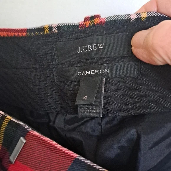 JCrew CameronSlim Crop Plaid Tartan Pants. Excellent sold out at JCrew. Sz4 Excellent Condition. 66% Wool ,29%polyester,5%elasten. lining is polyester. Great design no front pickets back has 2 fashion pocket slits. and seen runs down middle back kegs for a more Slimming silhouette. Great Pants for the Holidays .