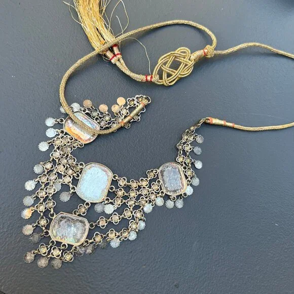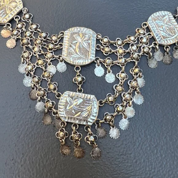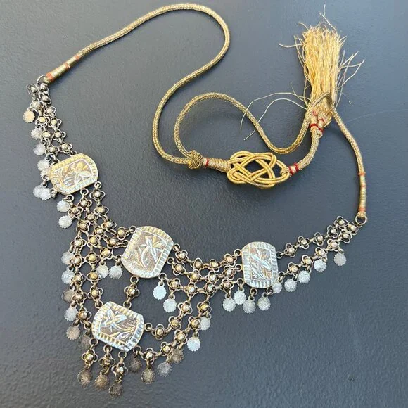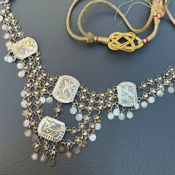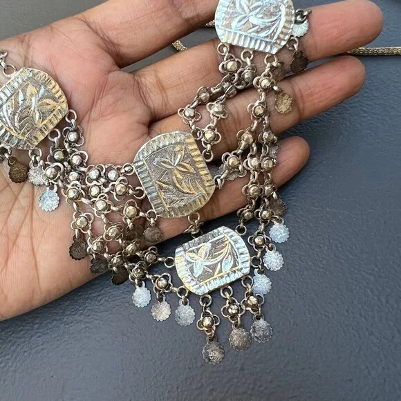 Fabulous ~ Light weight Vintage ~ Art deco ~ silver necklace from India with embossed /engraved silver panels with floral chains ~ Adjustable necklace length Unsigned /unmarked but acid test positive for higher silver (atleast 900 silver ).Dates early to mid 20th century .Materials :Silver (atleast 900 silver ) Measurements:Necklace front is 8 1/2 inches in length (necklace necklace can be increased or decreased by back thread cord ) x 3 inches max drop length .Weighs 27 grams on my weighing scale .Condition :Overall good vintage condition ~ Heavy age patina to silver ~ No major dents or dings ~ Did not see any missing charms .Please Note ~ As Antique /vintage items are previously loved /used please do expect some minor wear like surface wear /dents /dings and metal discoloration/age patina . All items are carefully inspected and major flaws will be listed separately ~ Plenty of photograph are added so please study the photos carefully as it is also part of description or if you need more pictures just message us we will be happy to provide them :)...Box is for display purpose does not included with the item .. but your items will be packed carefully and shipped promptly .Powered by ExportYourStore.com