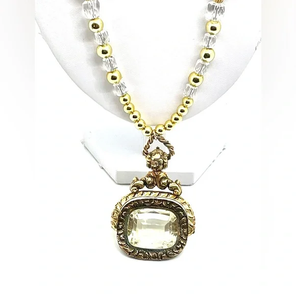This is a very vintage Citrine Pendant in which the large stone flips. The necklace has genuine vintage cut crystals and gold stone beads. The necklace length is 25” the pendant...