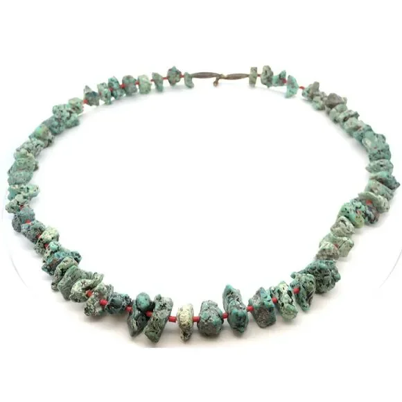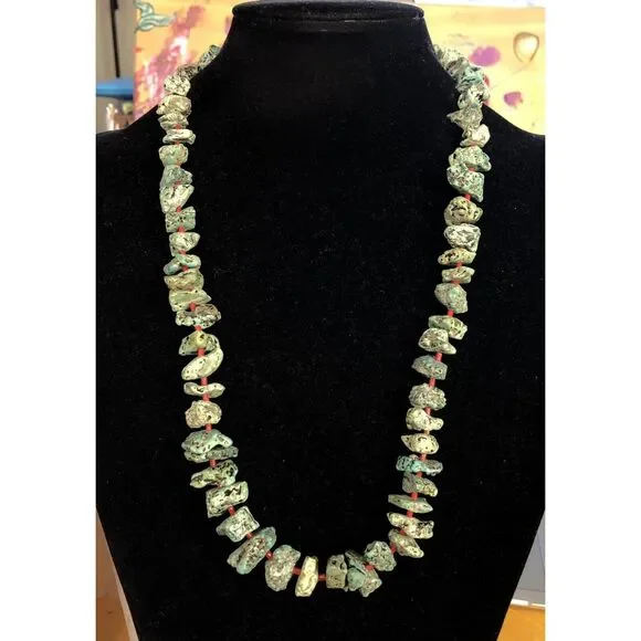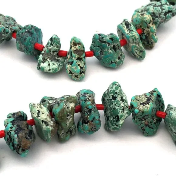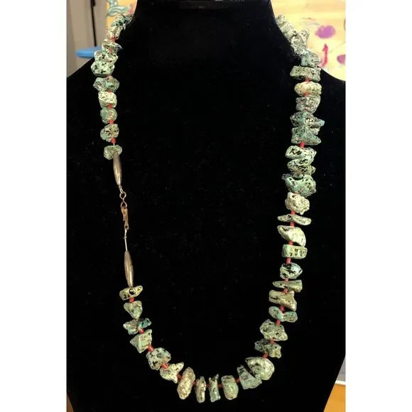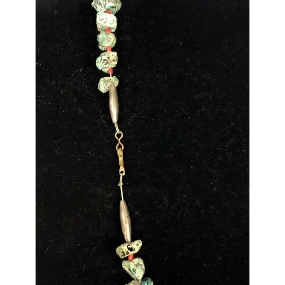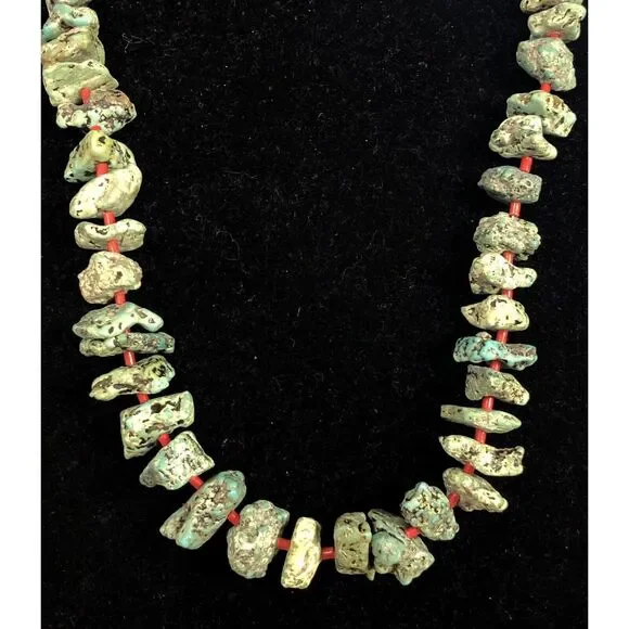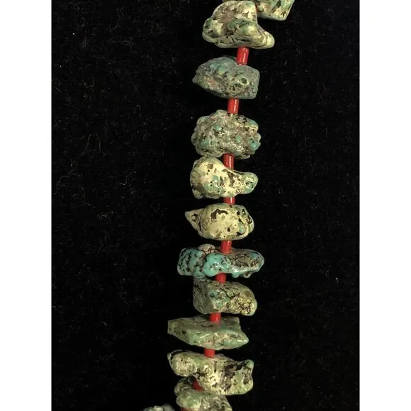 * Vintage Native American Silver Tone Turquoise Coral Bead Statement Necklace* Length: 23-1/2"* Width: 1/8" to 3/4"* Sixty (60) Natural Turquoise cabochons measure approximately...
