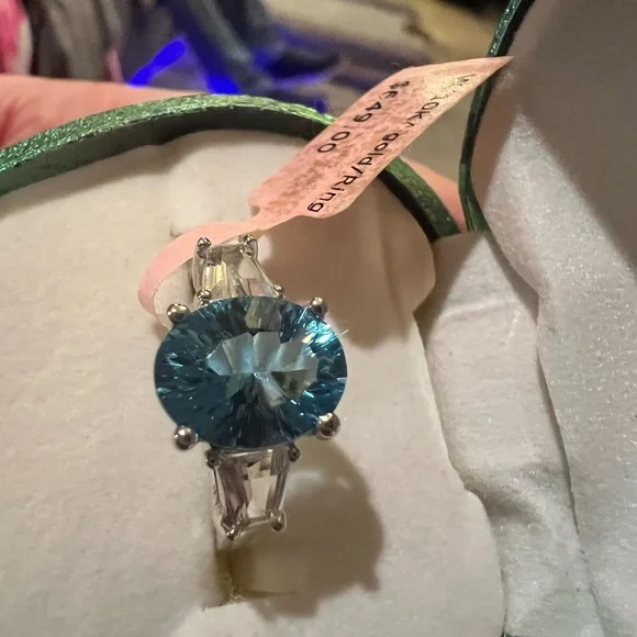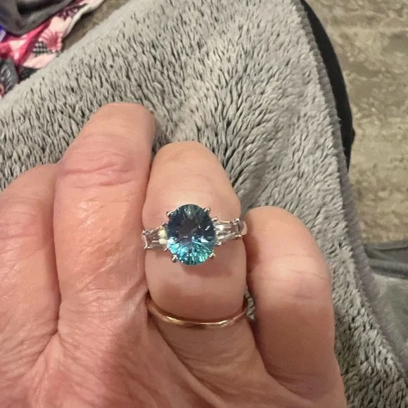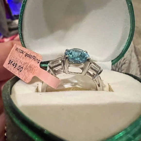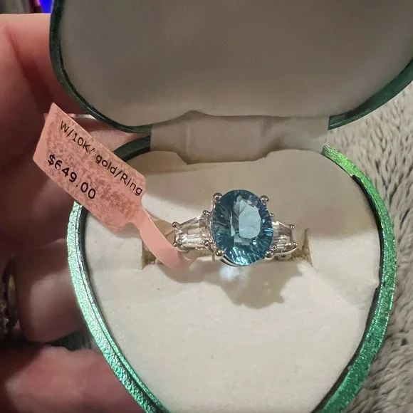 Stunning blue topaz gemstone centerpiece. Flanked by two clear topaz gemstones. Set in a 10k gold band. Perfect for special occasions.