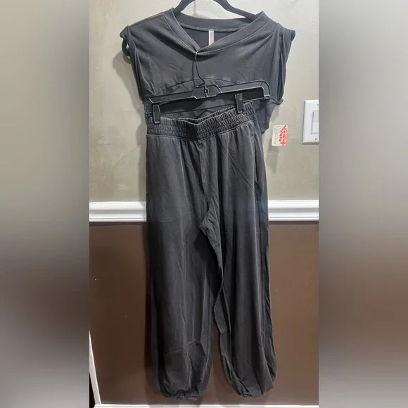 NWTSize SmallEffortlessly comfy, this set is easy to throw on before or after workouts, featuring a super soft fabrication and perfectly lived-in look.Fit: Relaxed fit; ankle length pantFeatures: Soft, jersey fabrication; relaxed fit; cropped muscle tee top with seaming detail; ankle length pant with high-rise waist and wide leg; elasticated waistband and cuffs; crossover detail on top; ribbed collar; side seam pocketsWhy We <3 It: This set is so versatile and can go anywhere with youA destination for life well-lived, Free People Movement offers performance-ready activewear, practice-perfect styles and beyond-the-gym staples.Care/ImportMachine Wash Cold95% Cotton, 5% Elastane