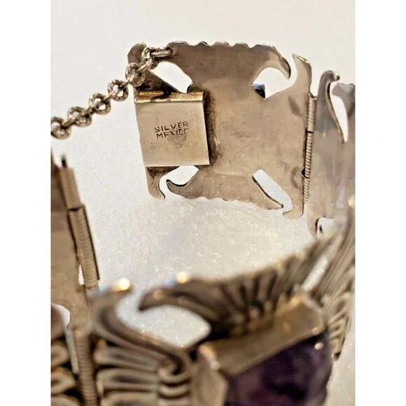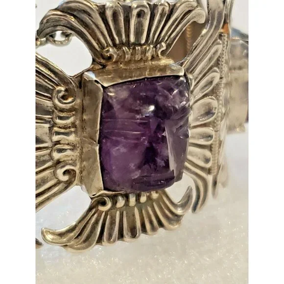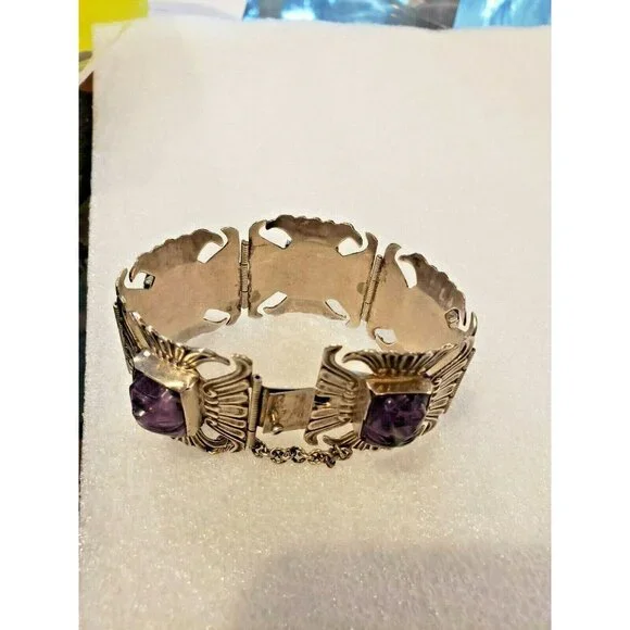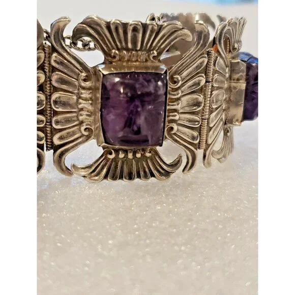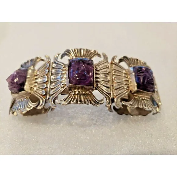 This listing consists of a 1940s mexico sterling bracelet with amethyst carved faces inlaid in each panel. It is in a wrist size 2.5" This is a very nice piece of jewelry for anyone. Please look at my other listing and email me with any questions.