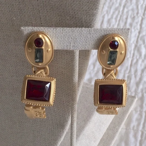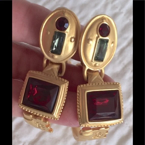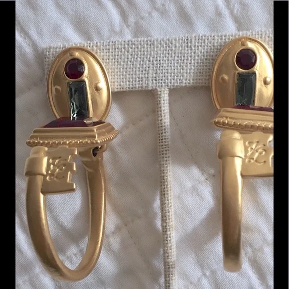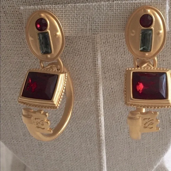 Pristine VTG & Rare, Karl Lagerfeld lock & key motif hoop earrings.Very comfortable clips, jeweled lock upper portion w/grey & deep red, key is the hoop & on the return is another large deep red jewel.I have never seen another pair like this & worn only a few times 35 years ago.