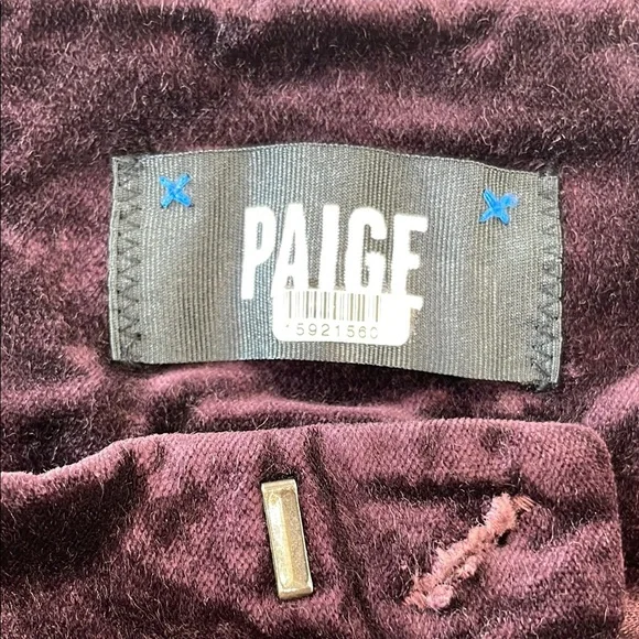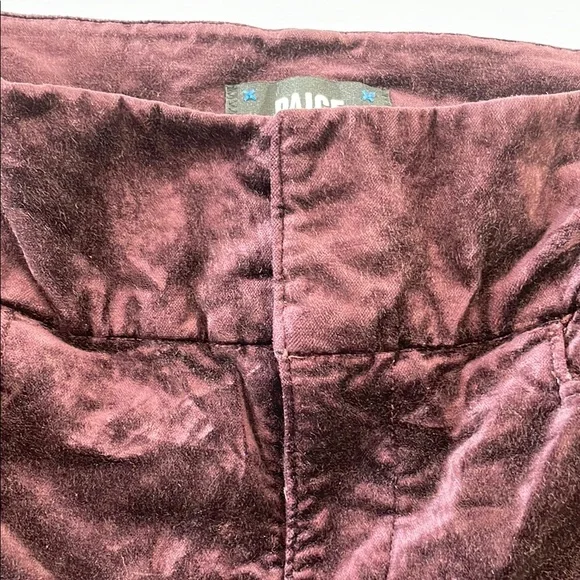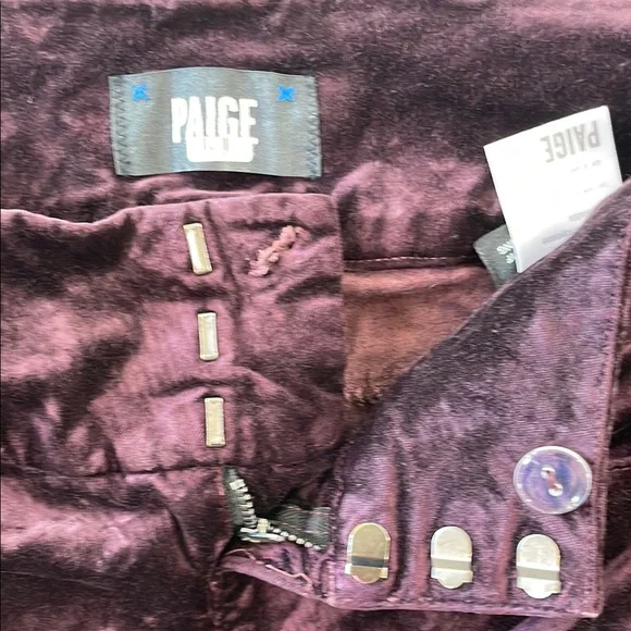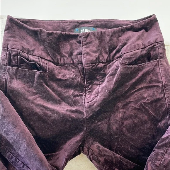 Be nostalgic for Y2K with these super fun and stylish purple velvet pants by PAIGE with bootcut/slight flare.An area of wear on back seam as shown in pictures.Front button is getting a little bit loose, could be reinforced. Used/Previously WornRed velvet (54% Cotton, 44% Rayon, 2% Spandex). Pants. Front zipper fly with button closure. 34" inseam. 13.5" rise. 21" leg opening. Imported.Welcome to Luxe_Repair! Here, you’ll find amazing fashion deals on high end designer pieces that need a little TLC to shine again. If you love a good project, have sewing skills, or know a great tailor, my closet is full of hidden gems waiting for a second life. Happy shopping, and feel free to drop a comment—I’d love to check out your closet too!