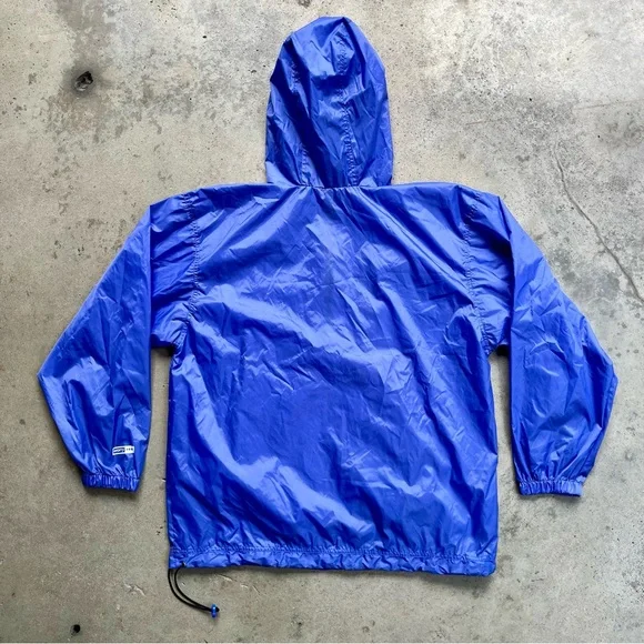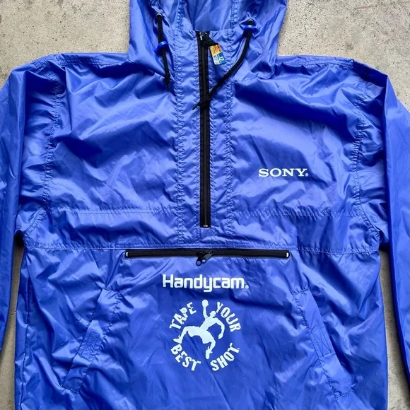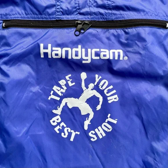 Vintage Handycam Windbreaker LargeMen´s size largeMeasurementsPit to pit: ~25”Collar to hem: ~29.5”This pullover anorak windbreaker is in good condition with minimal wear. It is a big boxy oversized fit. Elastic drawstrings for the hood and the waist to cinch it up how you want to. Quarter zip with a zipper kangaroo pouch on the front for your gear.Handycam Tape Your Best Shot graphic on the front - this was a promo piece for the Handycam back in the 90s. Woven label zipper pull tab.