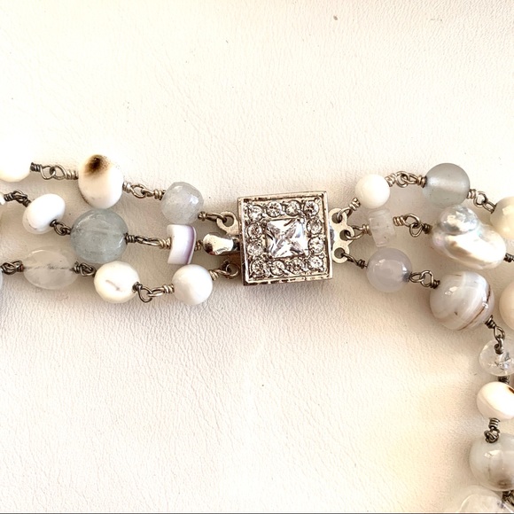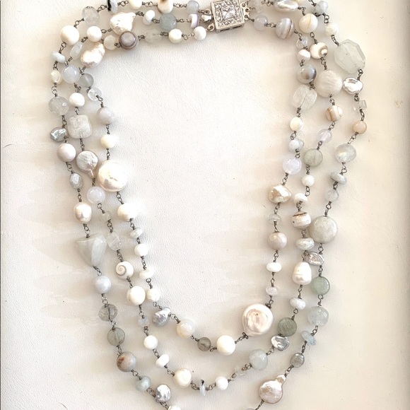 Gorgeous decadent moonstone, pearls, mother of pearl, silverite, aquamarine, white chalcedony and agate 16/17/18” strands with a beautiful sterling silver and crystal clasp