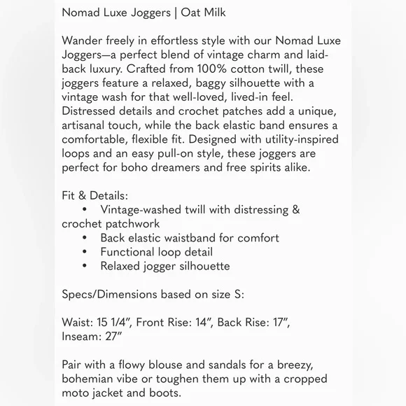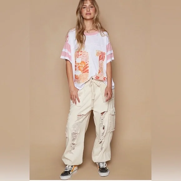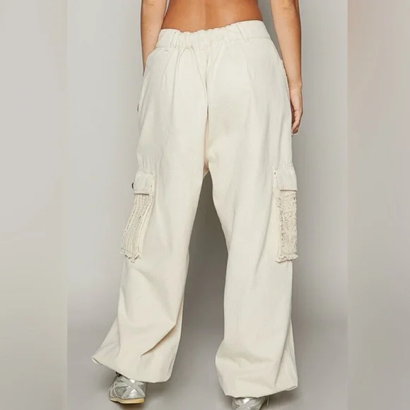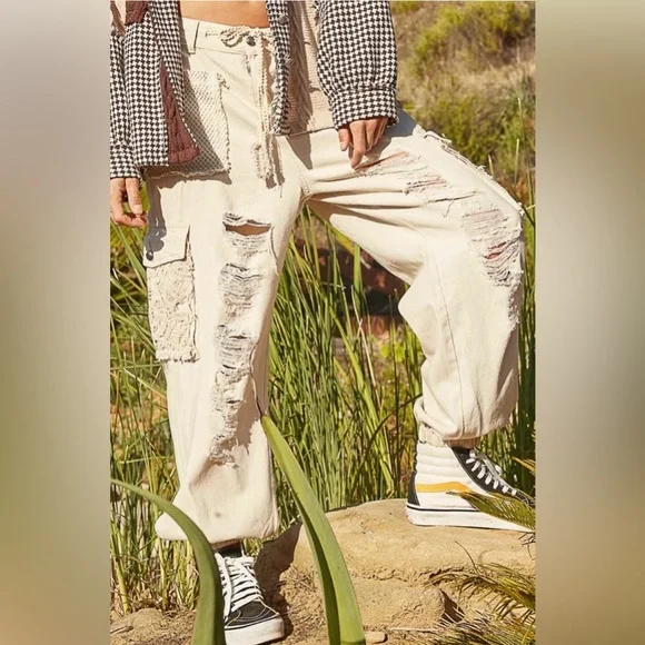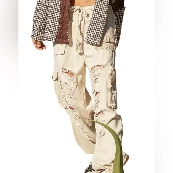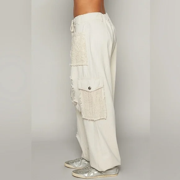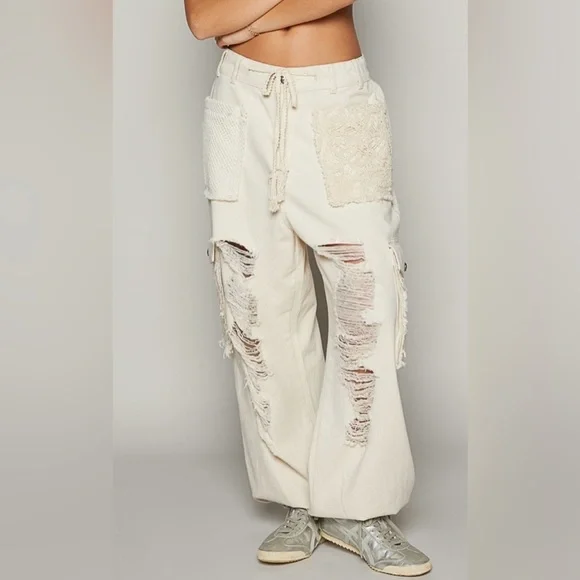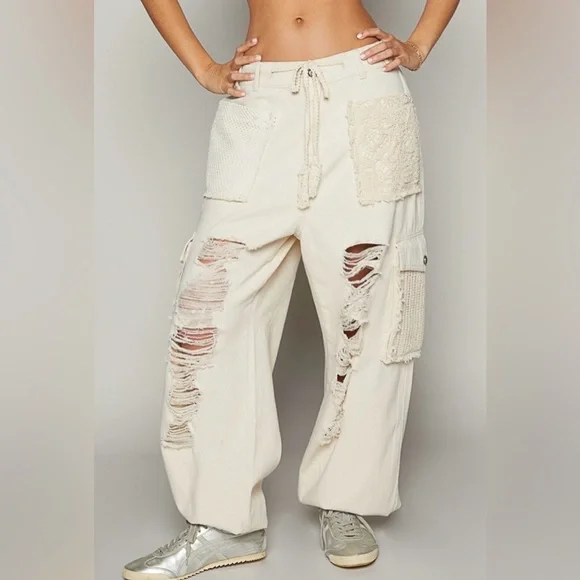NWOT POL Oat Milk Oversized Distressed Jogger Pants with Crochet Pocket Small
