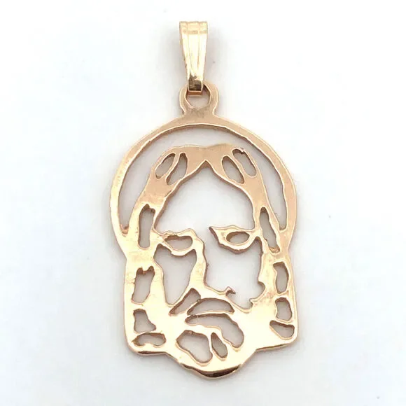 * Estate 14K Yellow Gold Jesus Christ Face Cutout Outline Pendant* Length including bale: 1-3/16"* Inner bale measures: 5 mm x 1.5 mm * Width: 5/8"* Weight: 1.6 g* Chain is not included, but can be purchased for an additional fee. * Marked: 14K * Condition: As pictured. * G4608