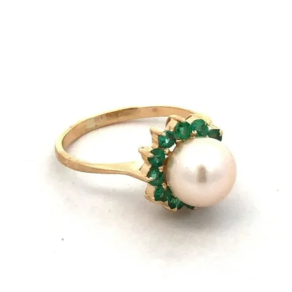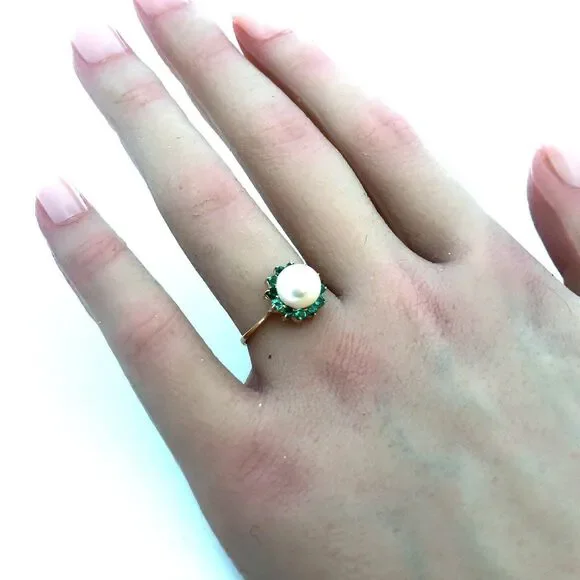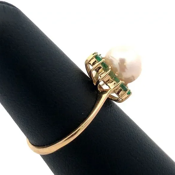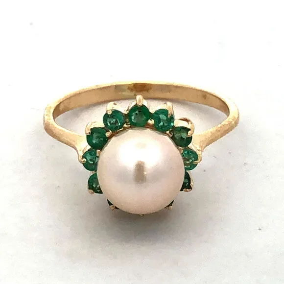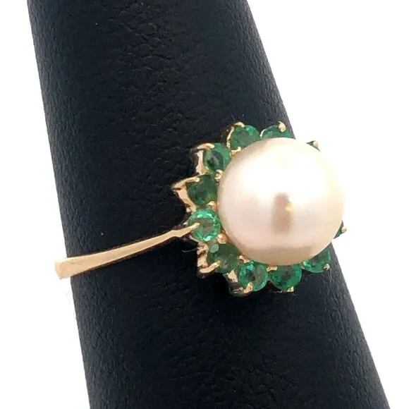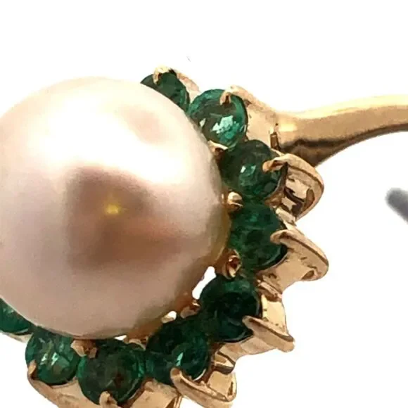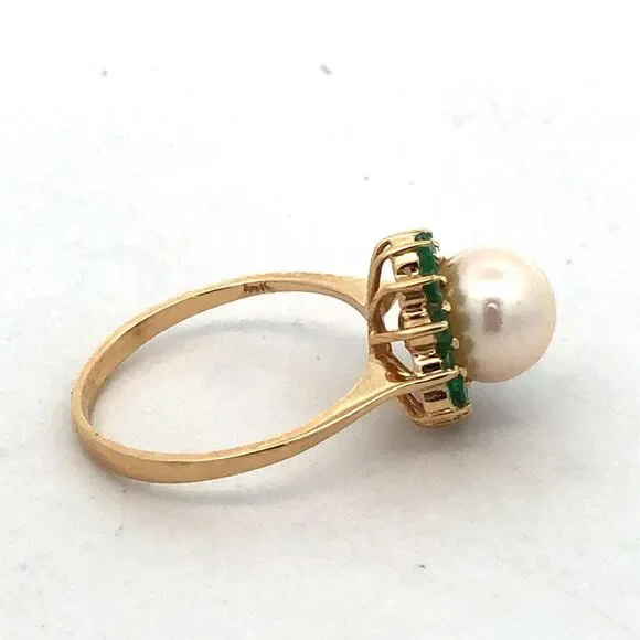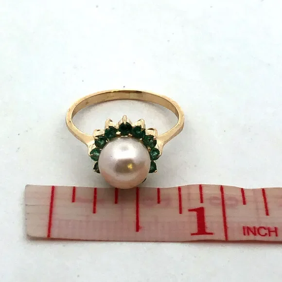 * Designer 14K Yellow Gold Round Pearl Green Tourmaline Halo Cocktail Ring* Ring size: 6 * Band width: 2 mm * Top of ring measures: 7/16"* Height: 3/8"* Weight: 2.4 tgw* 1 Round Pearl measures approximately 7.7 mm * 12 Round Tourmaline measure approximately 2.1 mm each* Ring can be resized for an additional fee. * Marked: 585 * Makers Mark* Condition: As pictured. * G4604