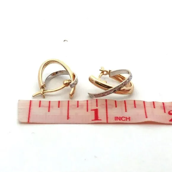 * Designer 14K Yellow White Gold Textured X Criss Cross Two Tone Hoop Earrings* Length: 5/8"* Width: 5/16"* Weight: 1.5 tgw* Closure: Snap * Marked: Israel * 14K * Makers Mark * Condition: As pictured. * G4573