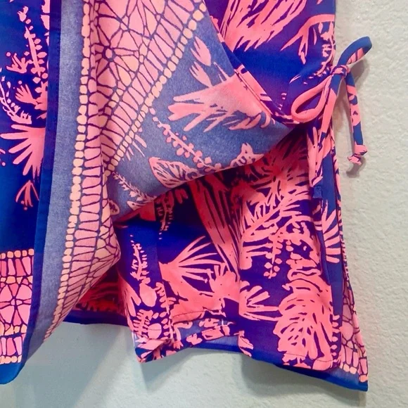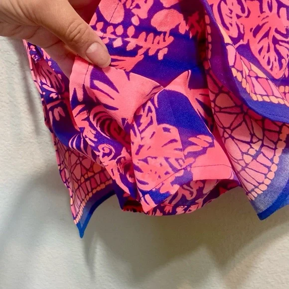 Lilly Pulitzer brand Donna Shift Navy Coral Romper SkortSize 0Navy and coral color Fully lined romperBows on the side slits Sleeveless Shell 100% polyesterLining 96% polyester 4% spandex Back zipper for easy useUsed but in good condition, please see pictures for details.
