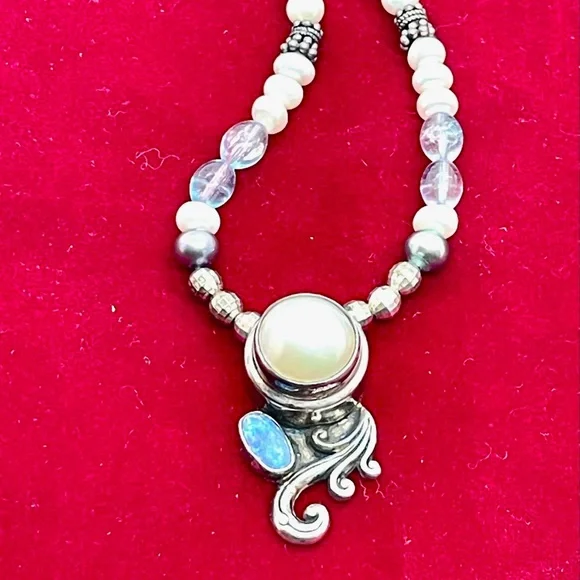If you love opals and pearls, this necklace is a must have for your collection!!!Opals and large pearls are quite expensive and this necklace has both!The 18” necklace is made up of sterling beads as well as pearls and glass beads. It has a magnetic clasp which I may change. Cat. 8231