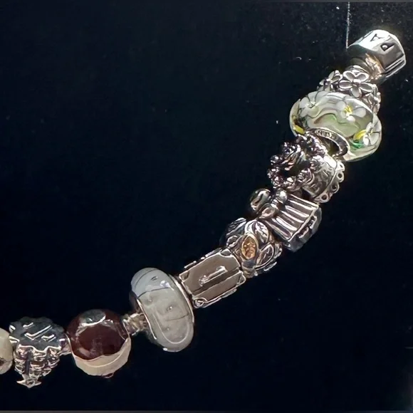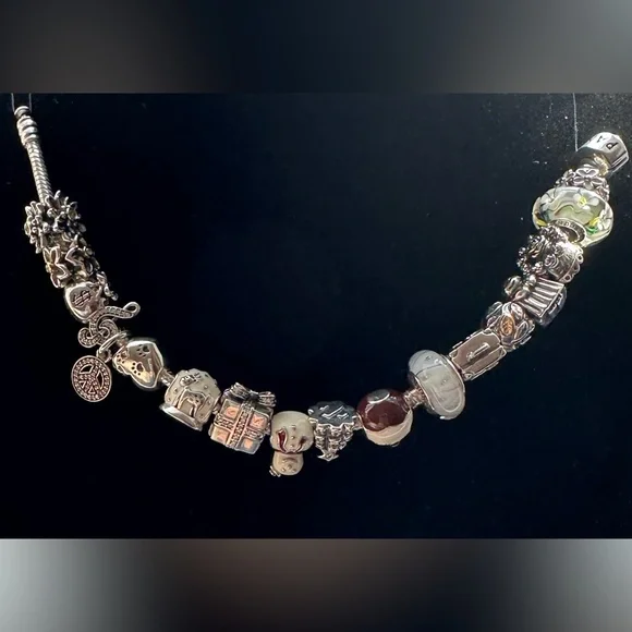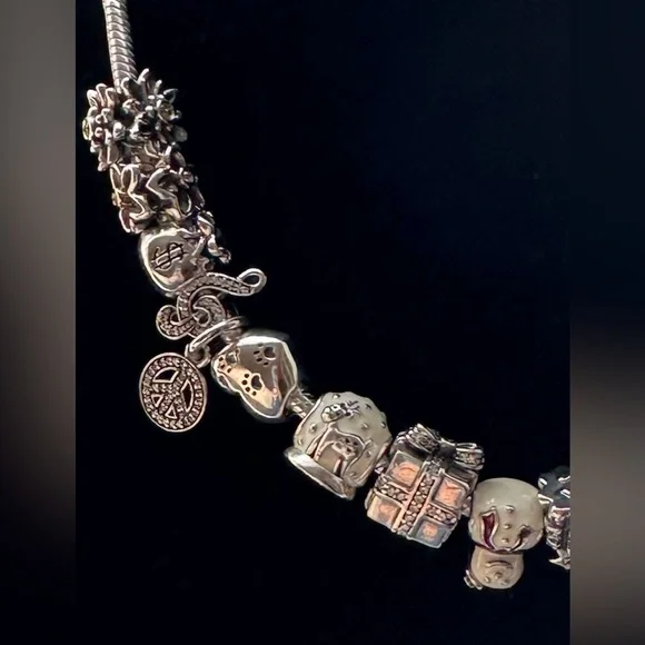 Authentic Pandora Snake Bracelet with 16 charms; 7.5” fits 6.7” wrist.